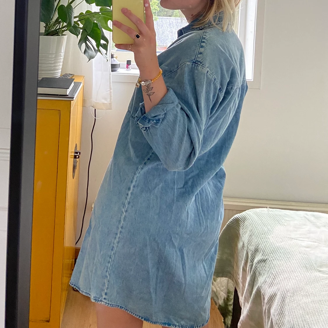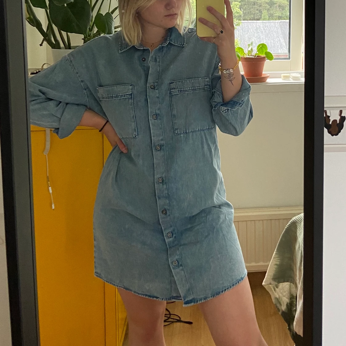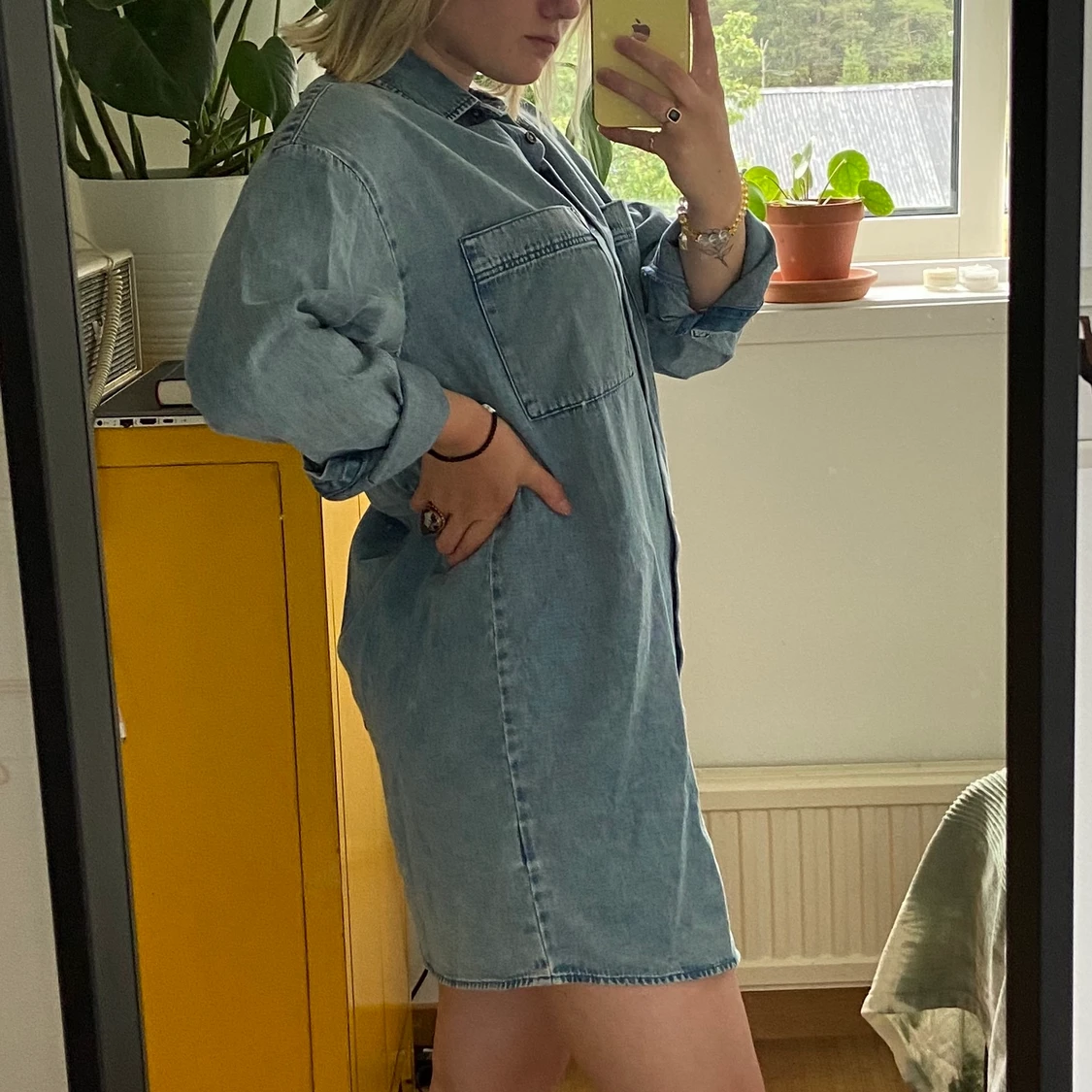 en jeansklänning i tunt tyg o därav perfekt nu till sommaren! aldrig använd men är för snygg för att bara hänga i garderoben. färgen är som på sista bilden. storlek är XS men är vanligtvis en S/M o sitter lagom oversize på mig. går att ha skärp till oxå✨💕