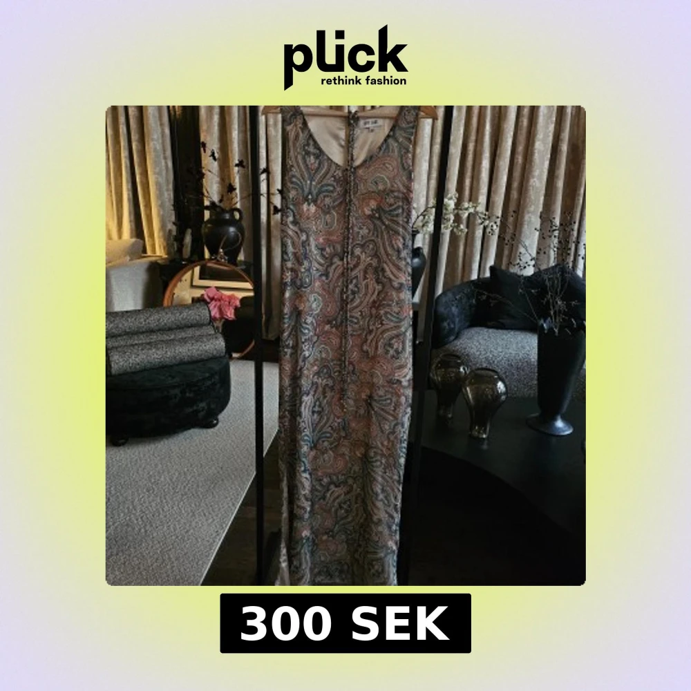 Supersnygg långklänning från Dry Lake med paisleymönster i beige, blått, rött och grönt. Ärmlös modell med u-ringning och knytband tillkommer. Klänningen har slits i sidan och är tillverkad i ett lätt, glansigt material som känns lyxigt.