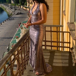 Använd en gång på balen. Det är paljetter över hela och ett band som man kan knyta och justera som man vill i nacken. Färgen är silver med en lätt lila underton.
