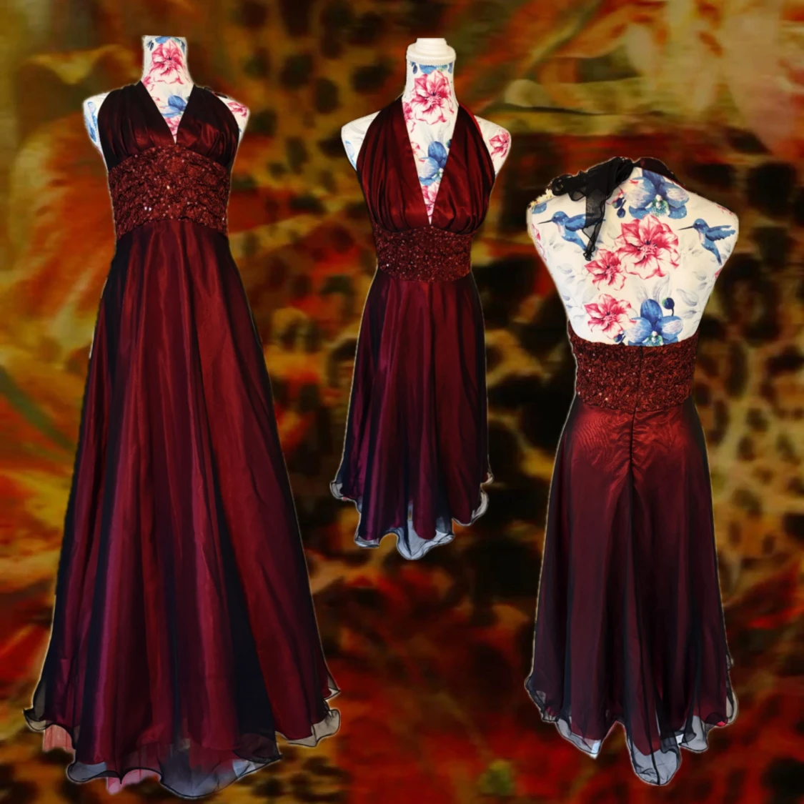 Säljer en vinröd långklänning med halterneck och djup v-ringning. Midjan är dekorerad med glittriga paljetter och tyget är lätt och svepande. Klänningen har öppen rygg med knyt i nacken och ett elegant fall. Perfekt för dig som vill sticka ut på bal eller fest! Passar en storlek 40!