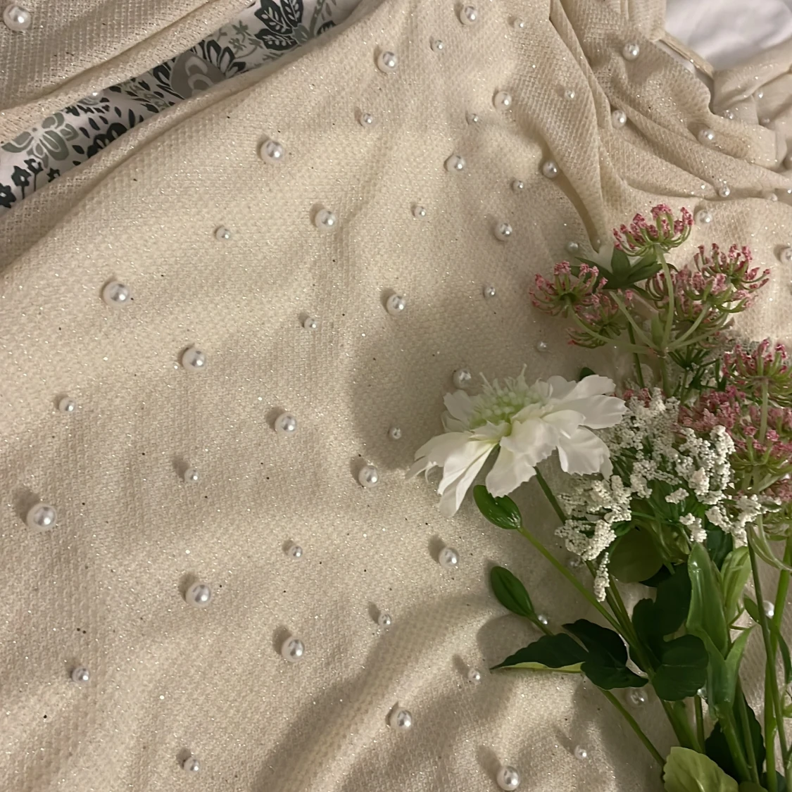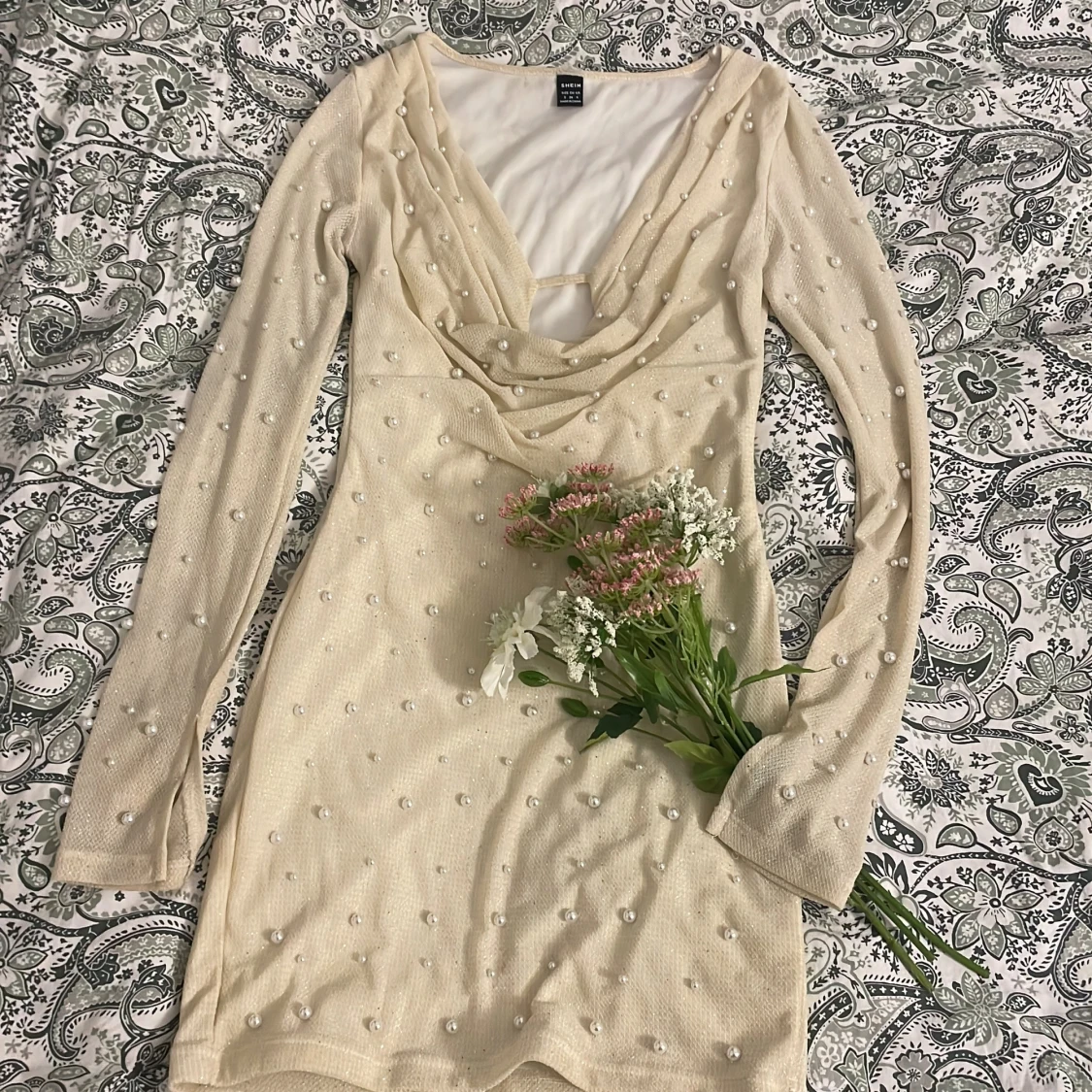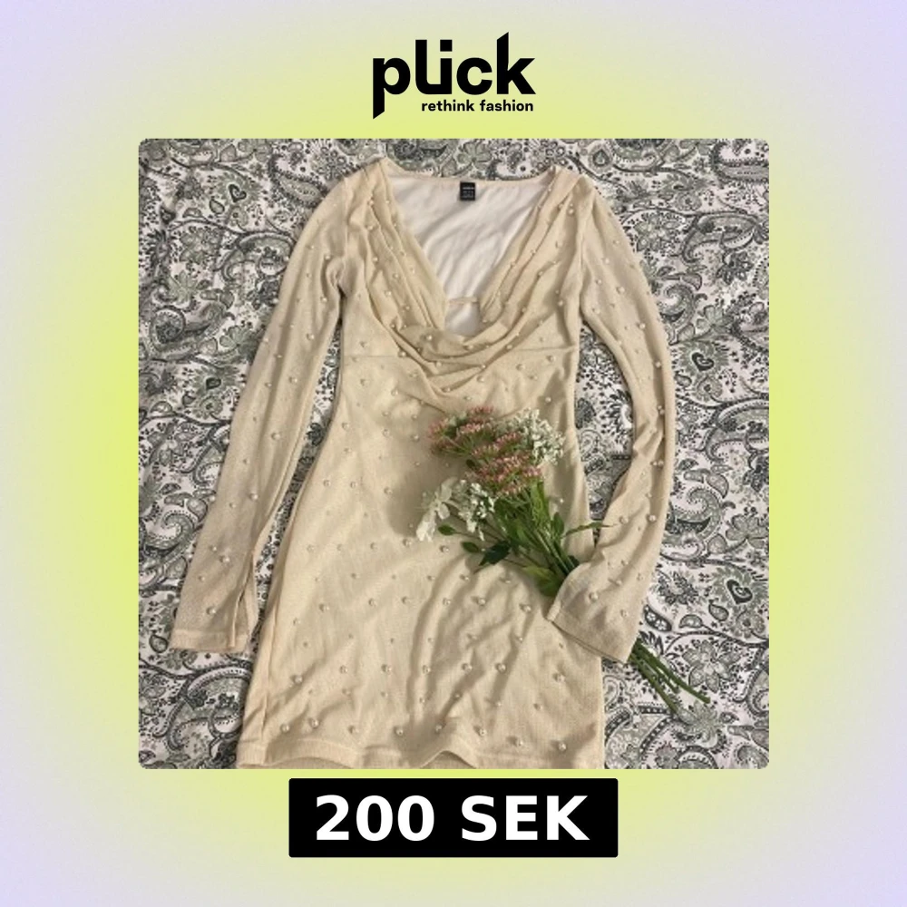 Superfin kort klänning från i champagnefärgat tyg med glittriga detaljer och pärlor över hela klänningen. Djup v-ringning med draperad front och långa ärmar. Perfekt för dig som vill sticka ut med en elegant och trendig look.
