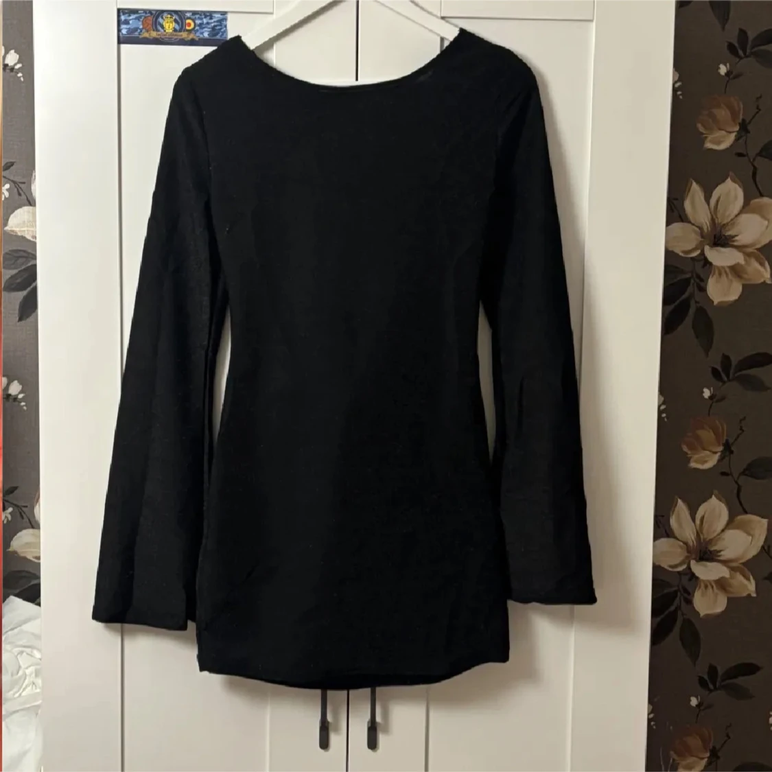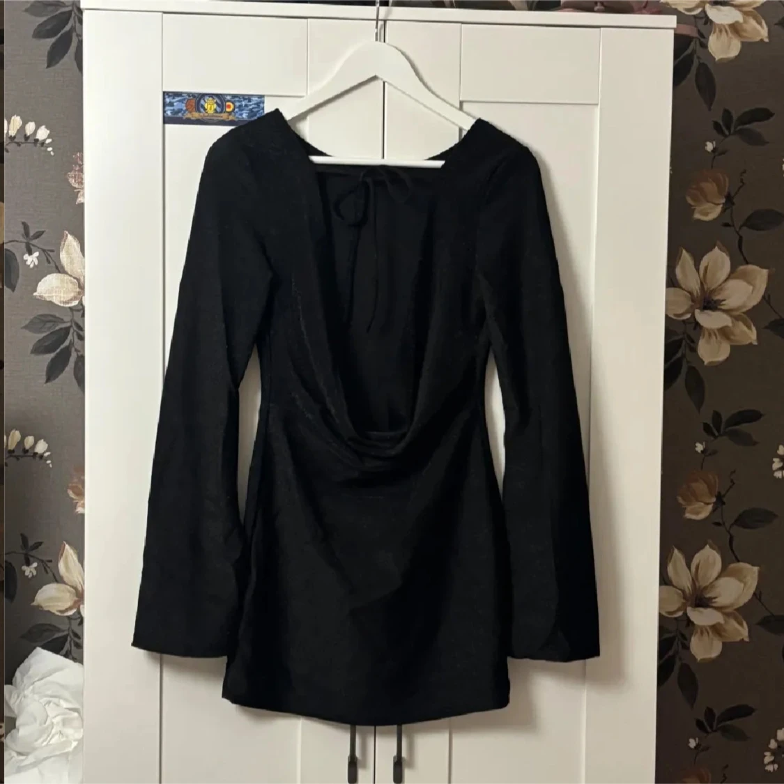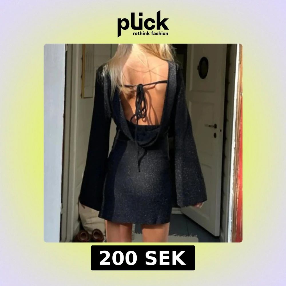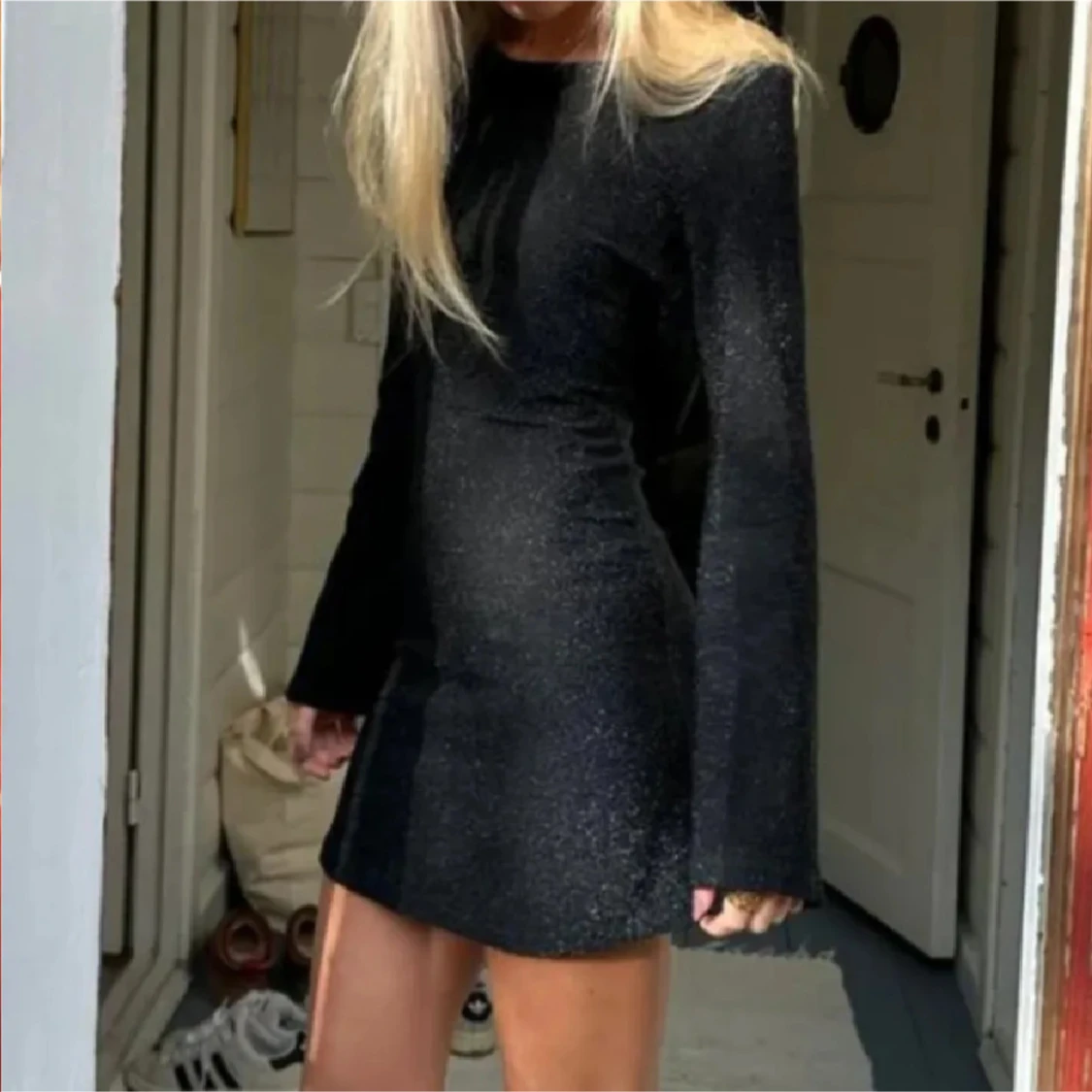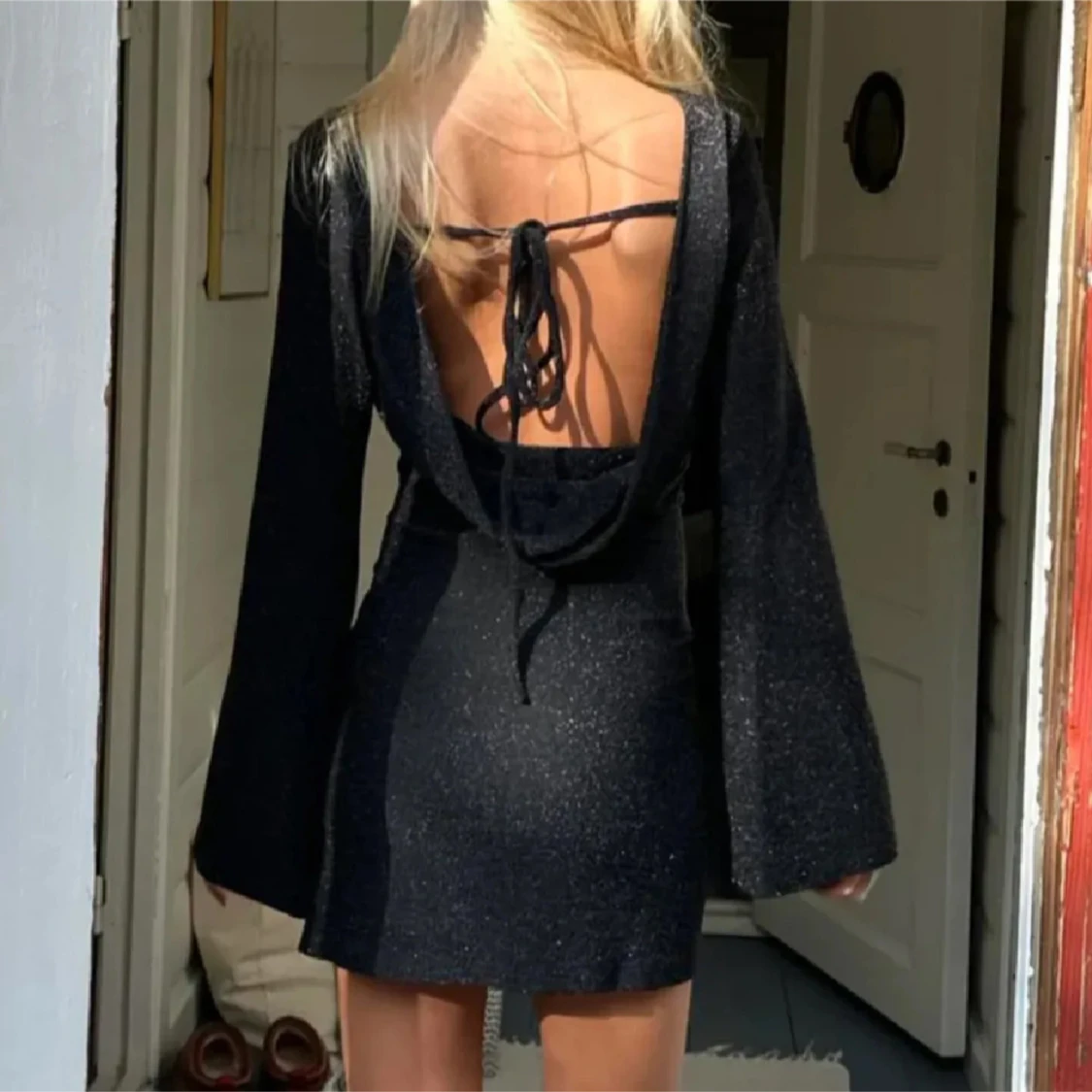Supersnygg svart kortklänning med glittrigt tyg och långa ärmar. Klänningen har en öppen rygg med snörning och en snygg draperad detalj baktill. Perfekt för dig som vill sticka ut med en cool och trendig look. Materialet är mjukt och följsamt. Ser ut exakt som den från design by si och är aldrig använd! Passar jättebra till fest och speciellt nyår.