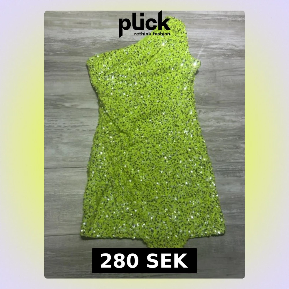 Säljer en limegrön kort paljettklänning från Forever New. Klänningen är oneshoulder och täckt av glittriga paljetter, med asymmetrisk nederkant och figurnära passform. Perfekt för dig som vill sticka ut och glänsa på nästa fest! Använd en gång bara till nyårs fest.