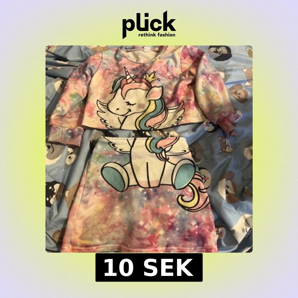 Säljer en söt sett från SHEIN i storlek 5Y med ett färgglatt pastellmönster och en stor unicorn-tryck framtill. Kjolen har resår i midjan och är gjord i mjuk bomull. Perfekt för dig som älskar magiska motiv och färger!