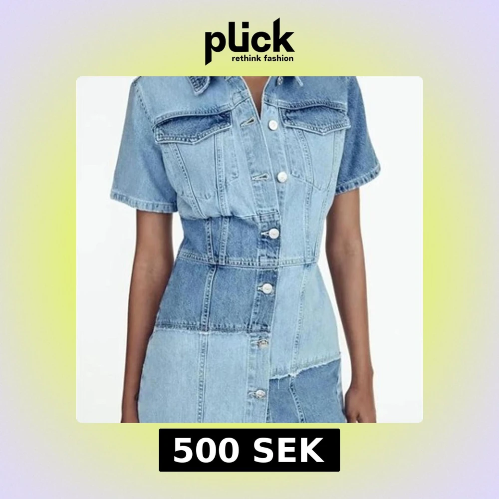 Trendig patchwork jeansklänning från Zara i olika blå nyanser. Klänningen har korta ärmar och knappar framtill. Perfekt till sommaren🌸😍