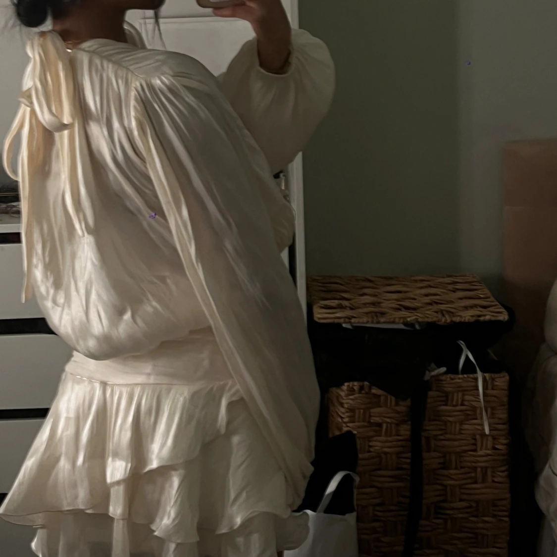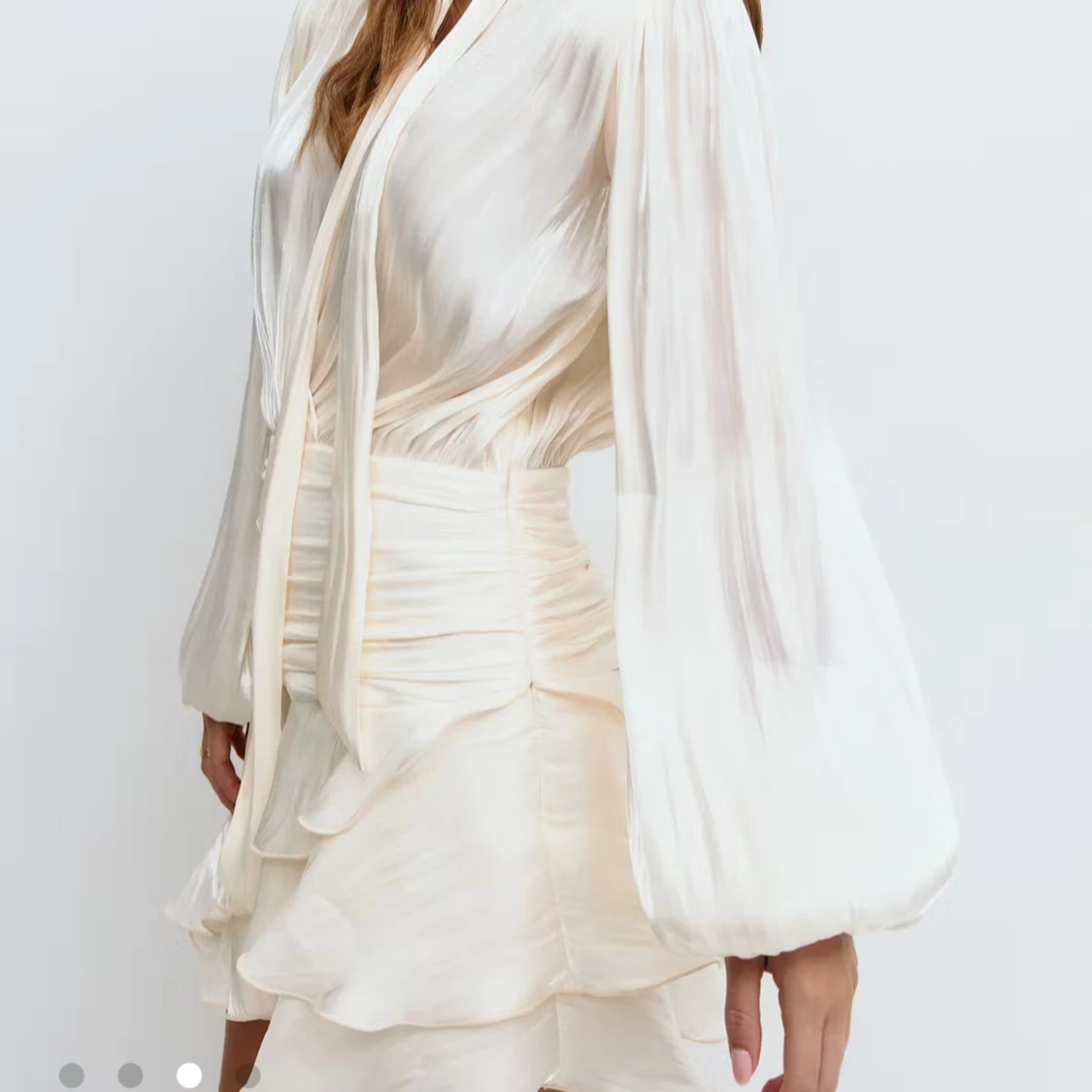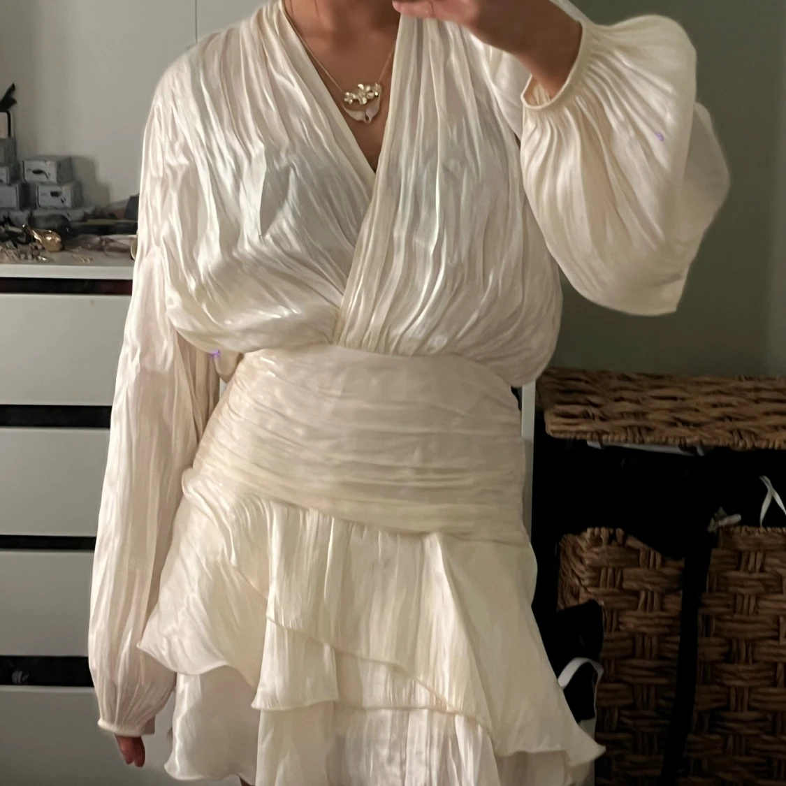 Superfin kort klänning i champagnefärgat, glansigt material med långa puffiga ärmar och volangig kjol. Djup v-ringning, knytband i nacken och markerad midja. Perfekt för dig som gillar flowiga och eleganta plagg. Köpte på Gina tricot för 600kr, helt ny har ej använt.