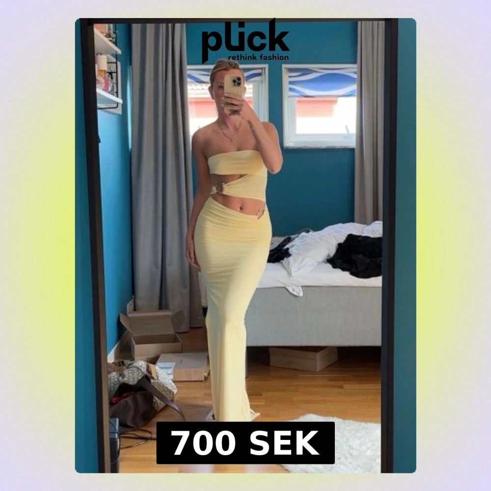Trendig långklänning i ljusgul nyans med cutout-detalj och slits. Klänningen är axelbandslös och har en snygg cut-out vid midjan med metallring. Perfekt för dig som vill sticka ut och känna dig extra stylish.