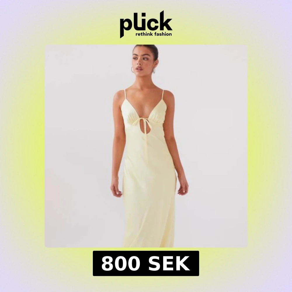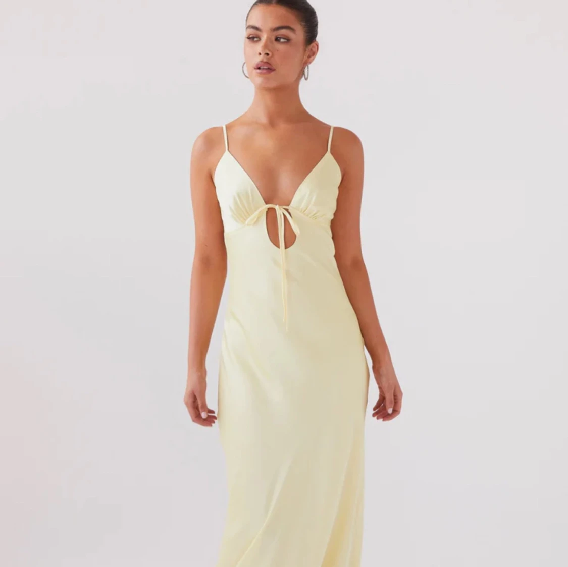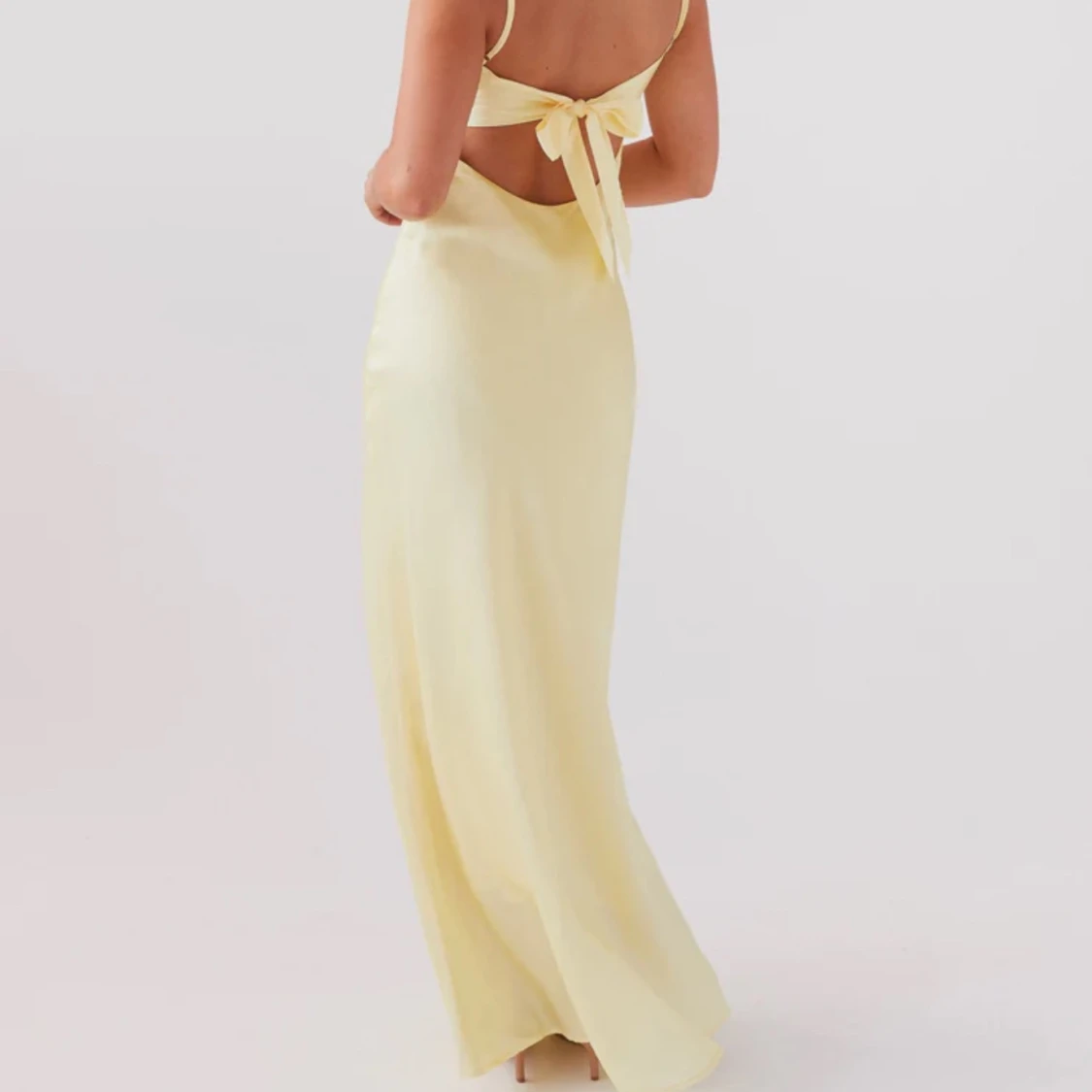 Säljer en ljusgul långklänning med smala axelband, v-ringning och snygg knytning framtill samt öppen rygg med stor rosett. Helt ny med prislapp, egna bilder kan skickas, vid förfrågan