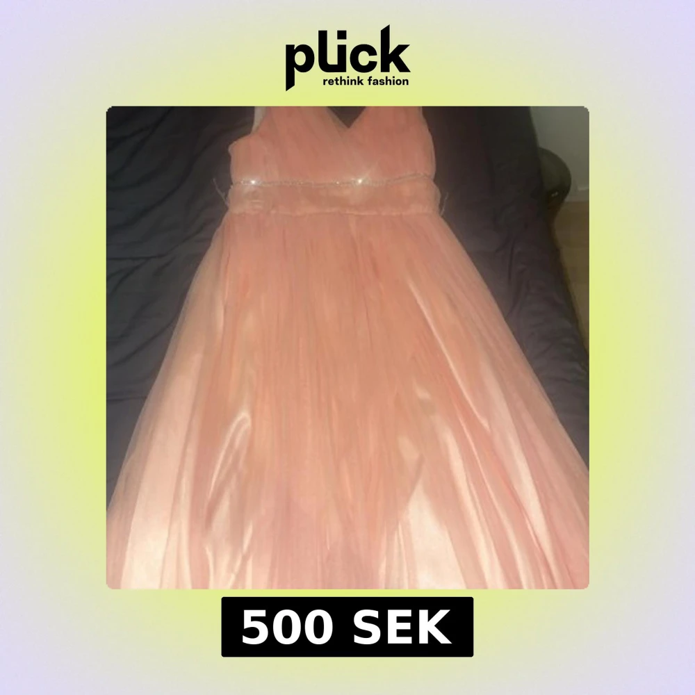 Elegant persikofärgad långklänning från Civil Girls med v-ringning och glittrande detaljer i midjan. Perfekt för speciella tillfällen med sin flytande design och ärmlösa stil.
