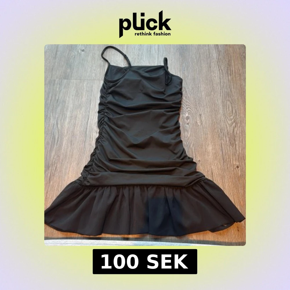 Svart kortklänning från SHEIN med smala axelband och snygga rynkade detaljer längs sidorna. Nederdelen har en bred volang som ger extra flärd. Klänningen är tillverkad i polyester med stretchig elastan för en tight och bekväm passform. Perfekt för dig som gillar trendiga och stilrena plagg.