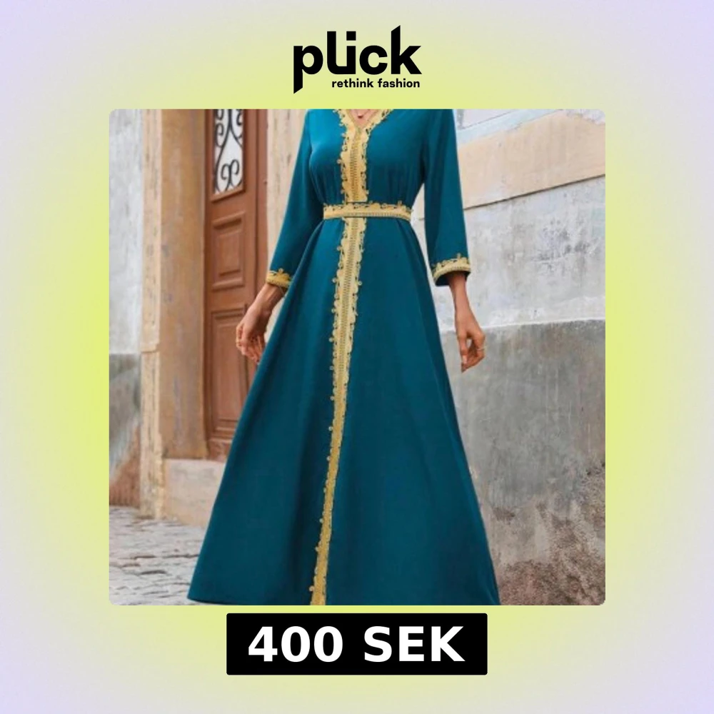 Snygg petrolblå långklänning med v-ringning och dekorativa guldiga broderier längs kanten och ärmsluten. Klänningen har ett matchande bälte i midjan och långa ärmar. Perfekt för dig som vill sticka ut med eleganta detaljer och klassisk siluett.