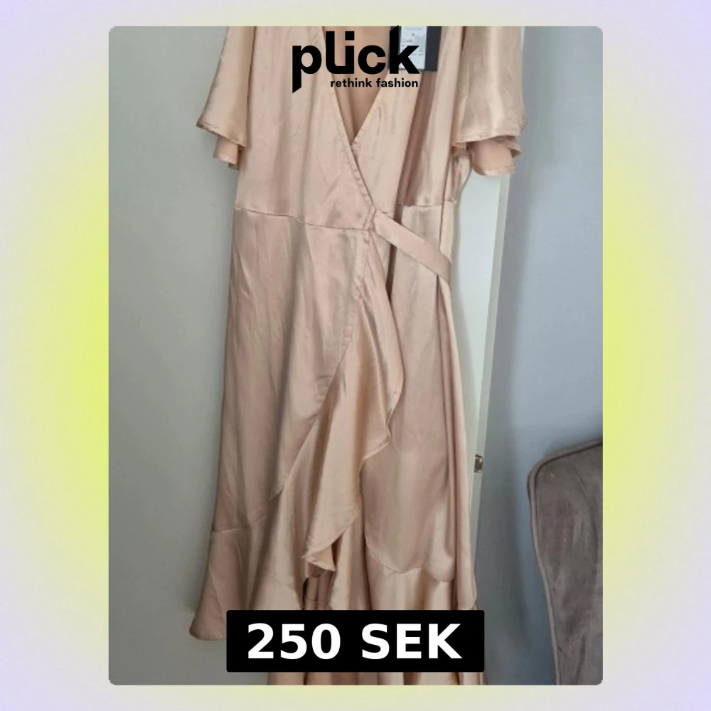 Elegant långklänning i champagnefärgad satin med omlottmodell och volangdetaljer. Klänningen har korta ärmar och ett knytband i midjan för en feminin siluett. Perfekt för dig som vill ha en stilren och lyxig look.