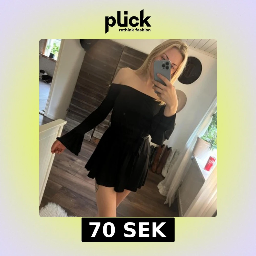 Supersnygg svart byxdress med offshoulder och långa utsvängda ärmar. Klänningen har ett knytband i midjan som framhäver figuren och ger en trendig look. Perfekt för dig som gillar stilrena och coola outfits. Stretchiga material så passar både xs och s