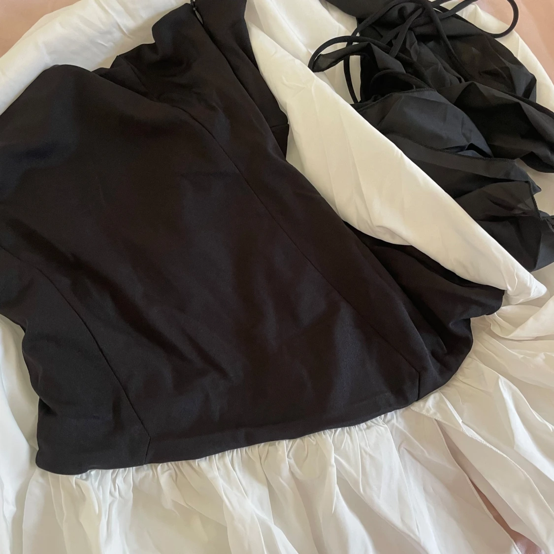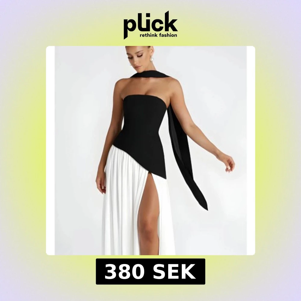 Supersnygg svartvit långklänning med asymmetrisk överdel och hög slits. Klänningen är axelbandslös och har en cool scarf-detalj runt halsen. Kjolen är vit och flowy medan överdelen är svart och figurnära. Perfekt för dig som vill sticka ut! Finns i storlek L, m