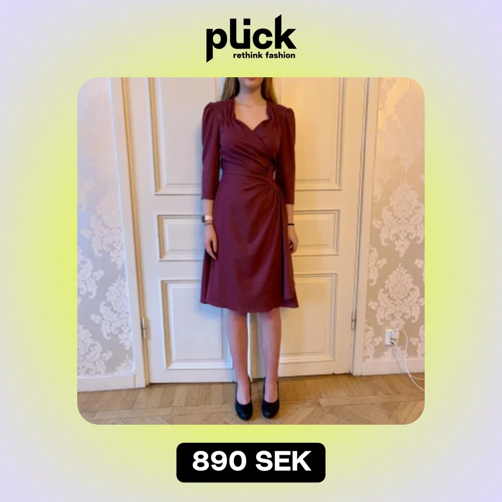 Fin plommon färgad omlott klänning. Storlek 38 Knytet gör att den passar storlekar 36-40 Modellen på bilden är 173 cm och har storlek 38 i de flesta andra kläder. Aldrig använd. Vi har lagt ner vår klänningsbutik och säljer ut. Ny pris är 2000-3000kr