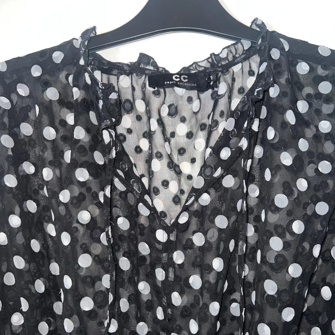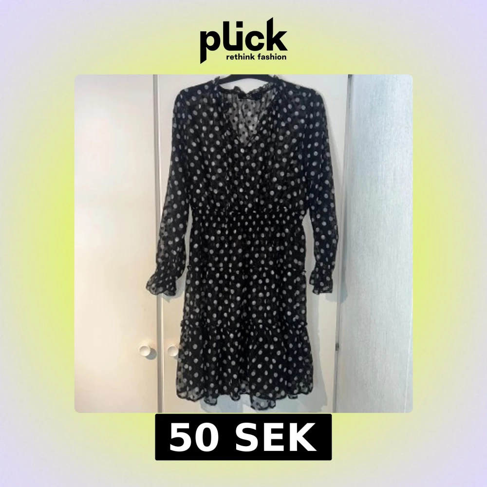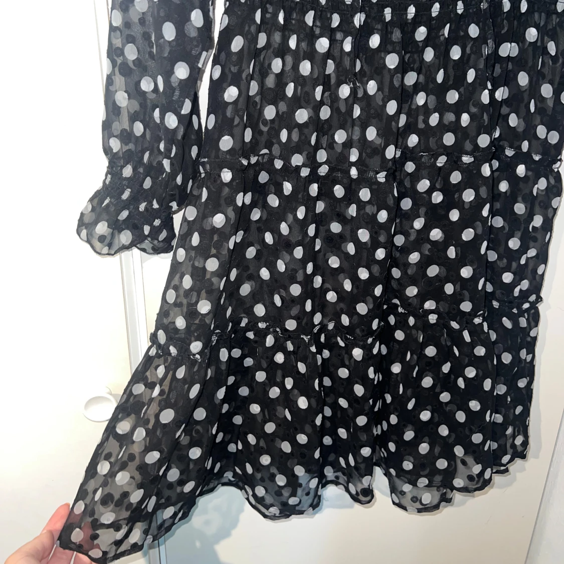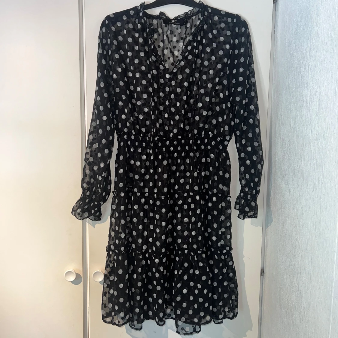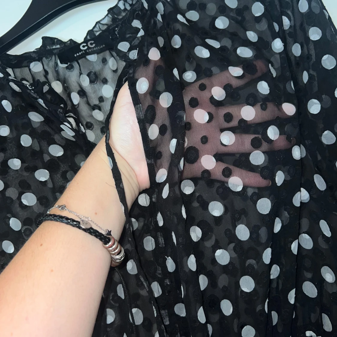 Supersöt svart kortklänning från Capri Collection med vita prickar. Klänningen har v-ringning, långa ärmar med resår vid ärmslut och volangdetaljer nertill. Tunt, transparent material som ger en luftig känsla. Perfekt för dig som gillar lekfulla mönster! Inköp för ca 800kr. Fåtal använd. Passar S-XL