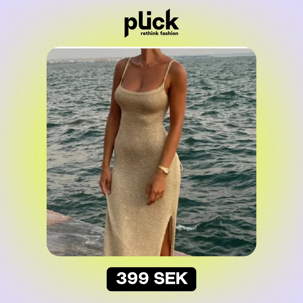 Säljer en helt oanvänd guldig klänning. Den passar någon med storlek xs-m, då den är stretchig. OBSERVERA: att klänningen är i längden midi🤍🐚