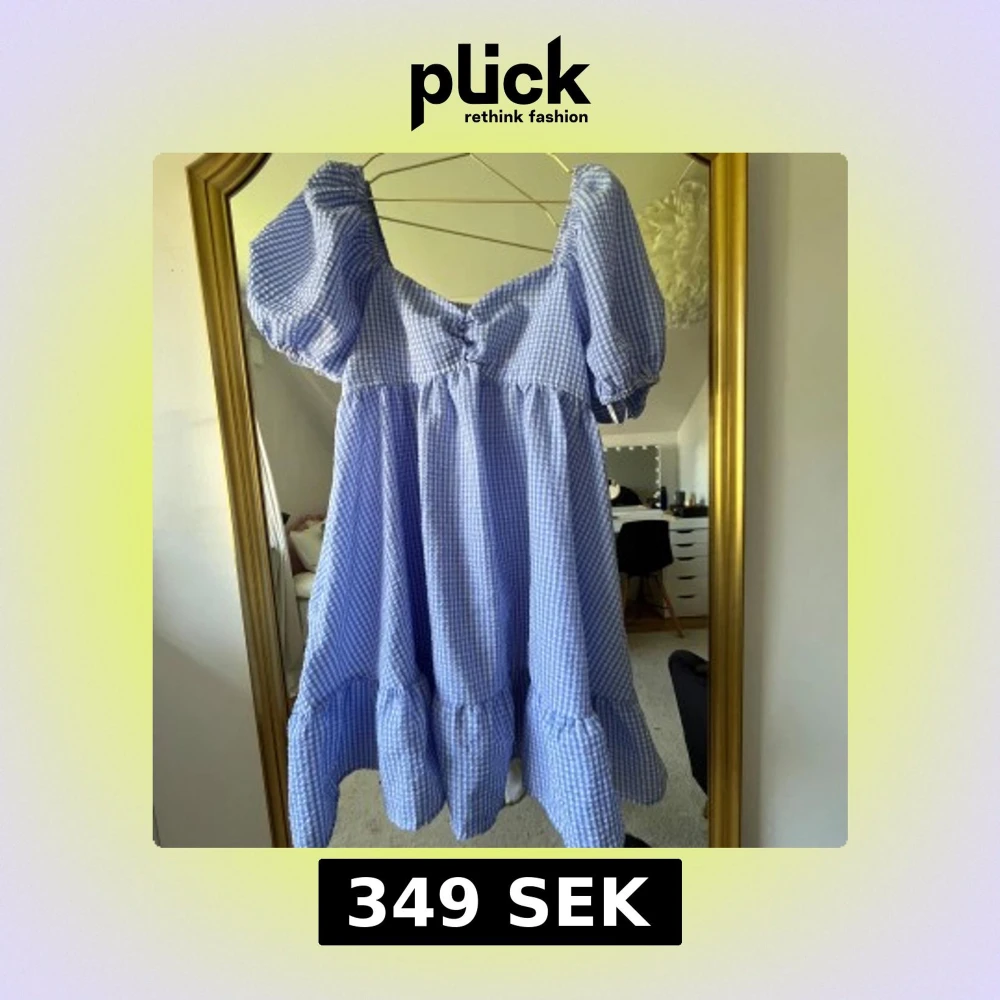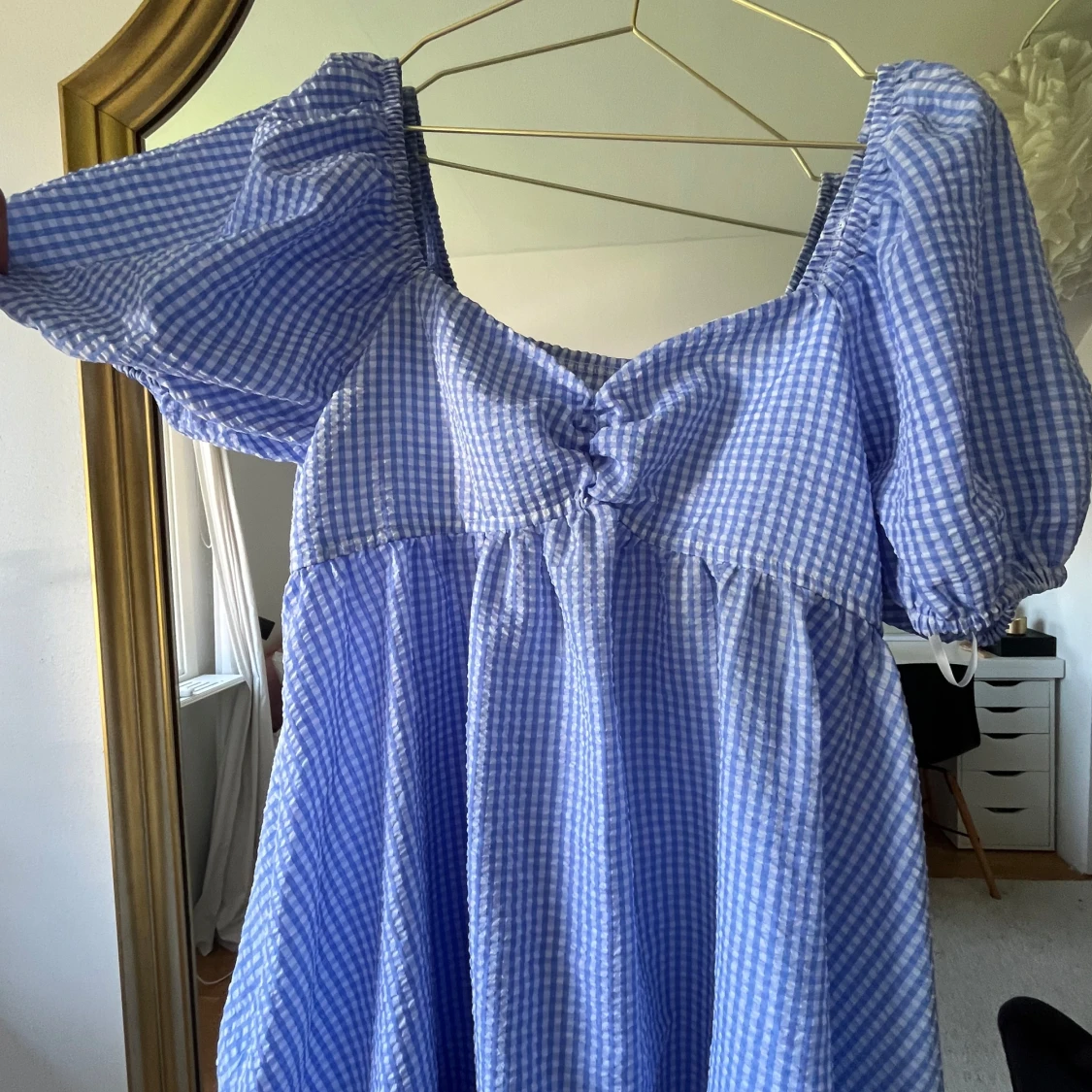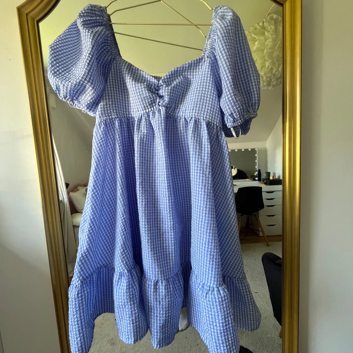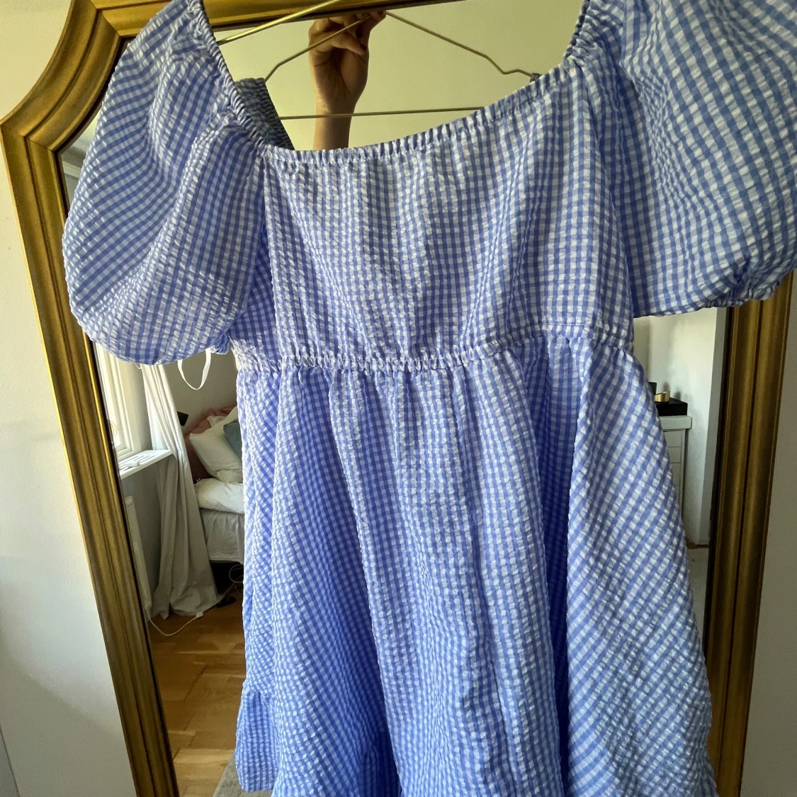 Supersöt blåvit rutig kortklänning med puffiga kortärmar och v-ringning framtill. Klänningen har volang nertill och smockdetaljer vid ärmslut och axlar. Endast använd 1 gång💕