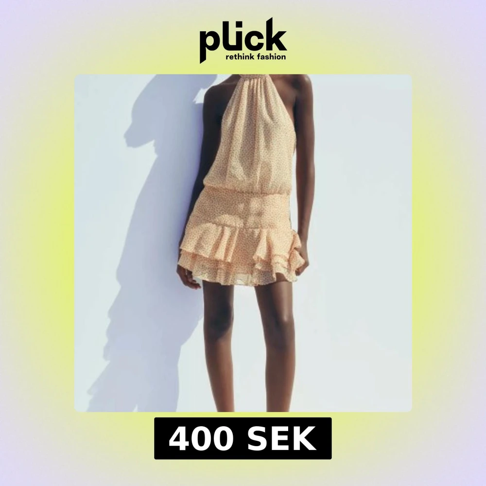 Superfin kort klänning från Zarai ljusgul med små blommor i oranget. Halterneck med öppen rygg och volangkantad kjol. Luftigt material, perfekt för varma dagar. Sitter så fint och har en flowy känsla. Den är slutsåld på hemsidan. Storlek m, helt ny med lapp kvar🌸💞