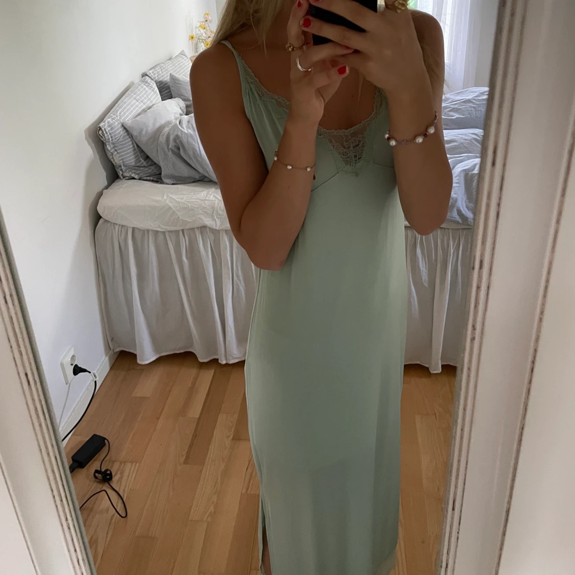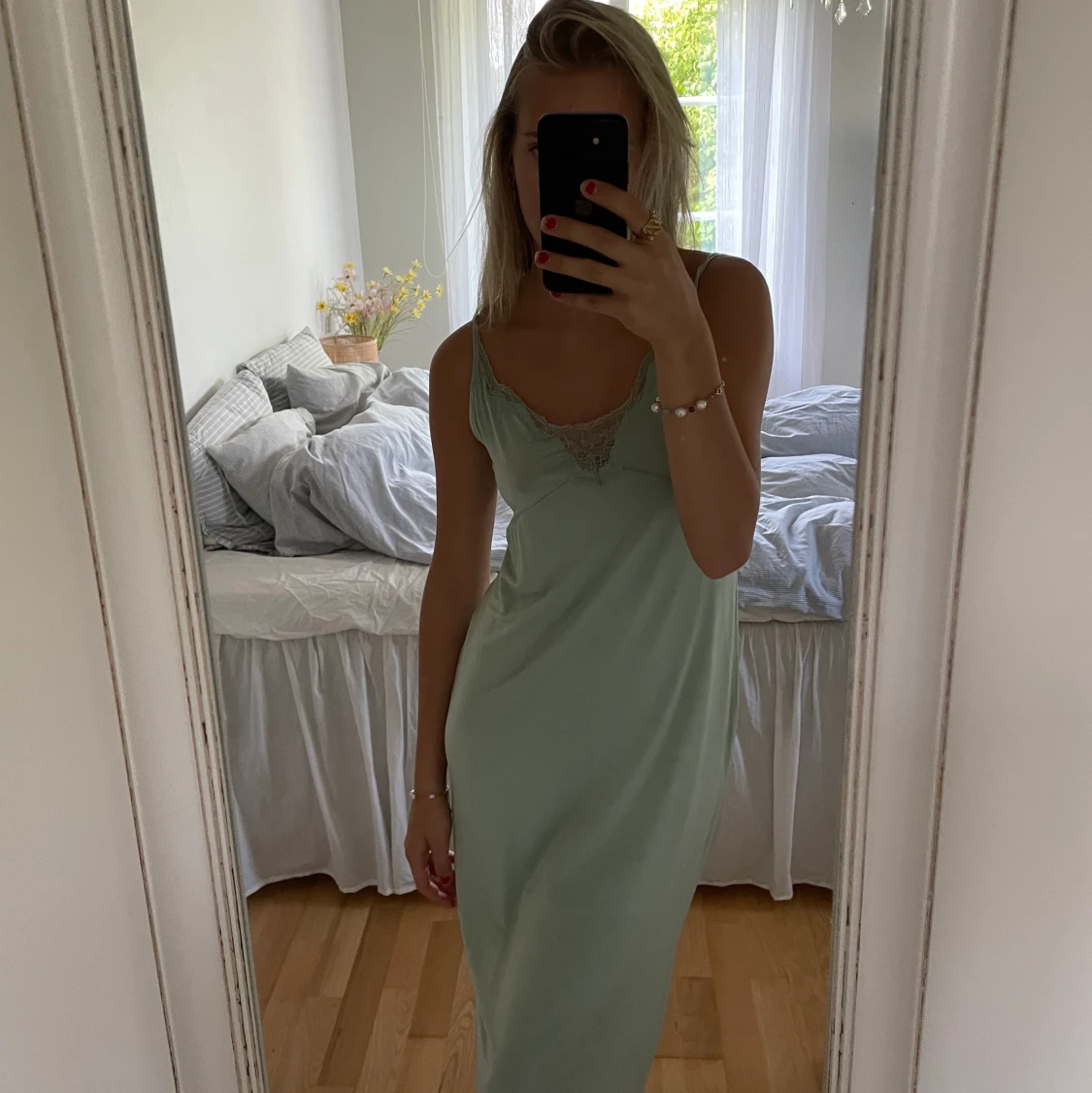 En sååå fin mintgrön klänning med spets kanter💞💞💞 jag har själv sytt upp banden litegrann men den är fortfarande väldigt stretchig och kan passa ända upp till en M😇
