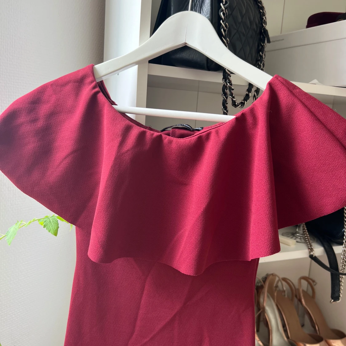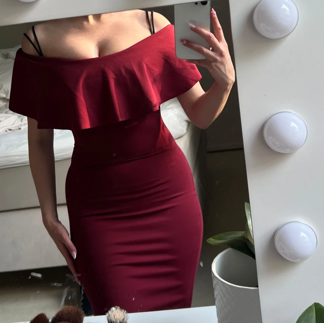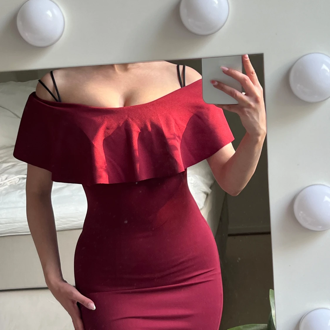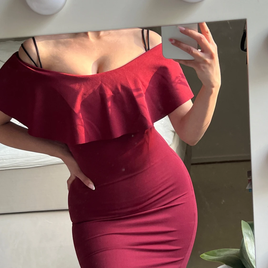 Säljer en vinröd, figurnära klänning med offshoulder och bred volang över bysten. Klänningen är lång och har en tight passform som framhäver formerna. Perfekt för dig som vill sticka ut med en elegant och trendig look.