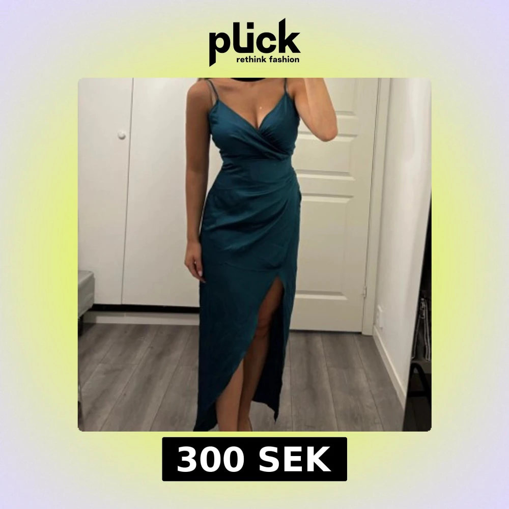 Snygg mörkgrön långklänning med omlottliv, smala axelband och djup v-ringning. Klänningen har en markerad midja och en hög slits framtill som ger en elegant look. Perfekt för dig som vill sticka ut med stilren design.