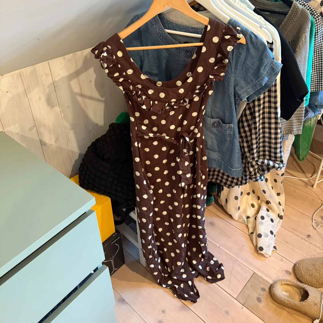 Supersnygg brun långklänning med vita prickar och volangdetalj vid urringningen. Klänningen är ärmlös och har en figurnära passform som ger en riktigt chic look. Inköpt i början av sommaren men använd 1-2 gånger pga lite liten för mig… storlek XS/S