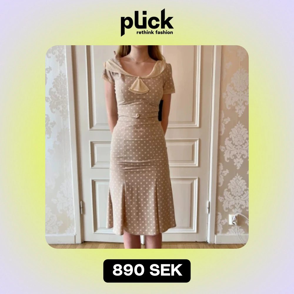 Jättefin beige prickig klänning i skönt material. Storlek M. Lite stretch. Modellen på bilden är 173 cm och har storlek 38 i de flesta andra kläder. Aldrig använd. Vi har lagt ner vår klänningsbutik och säljer ut. Ny pris är 2000-3000kr