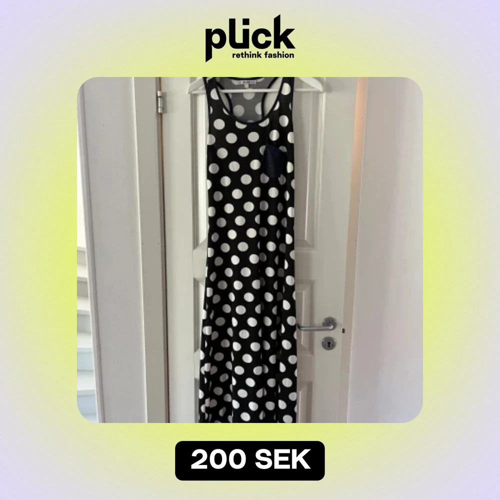 Prickig klänning svart, vit med en blå ficka på bröstet. Stl. L