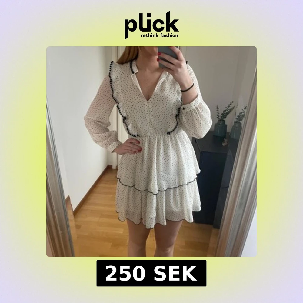 Vit klänning med svarta prickar och volangdetaljer. Den har en v-ringad design och långa ärmar. Perfekt till sommaren!