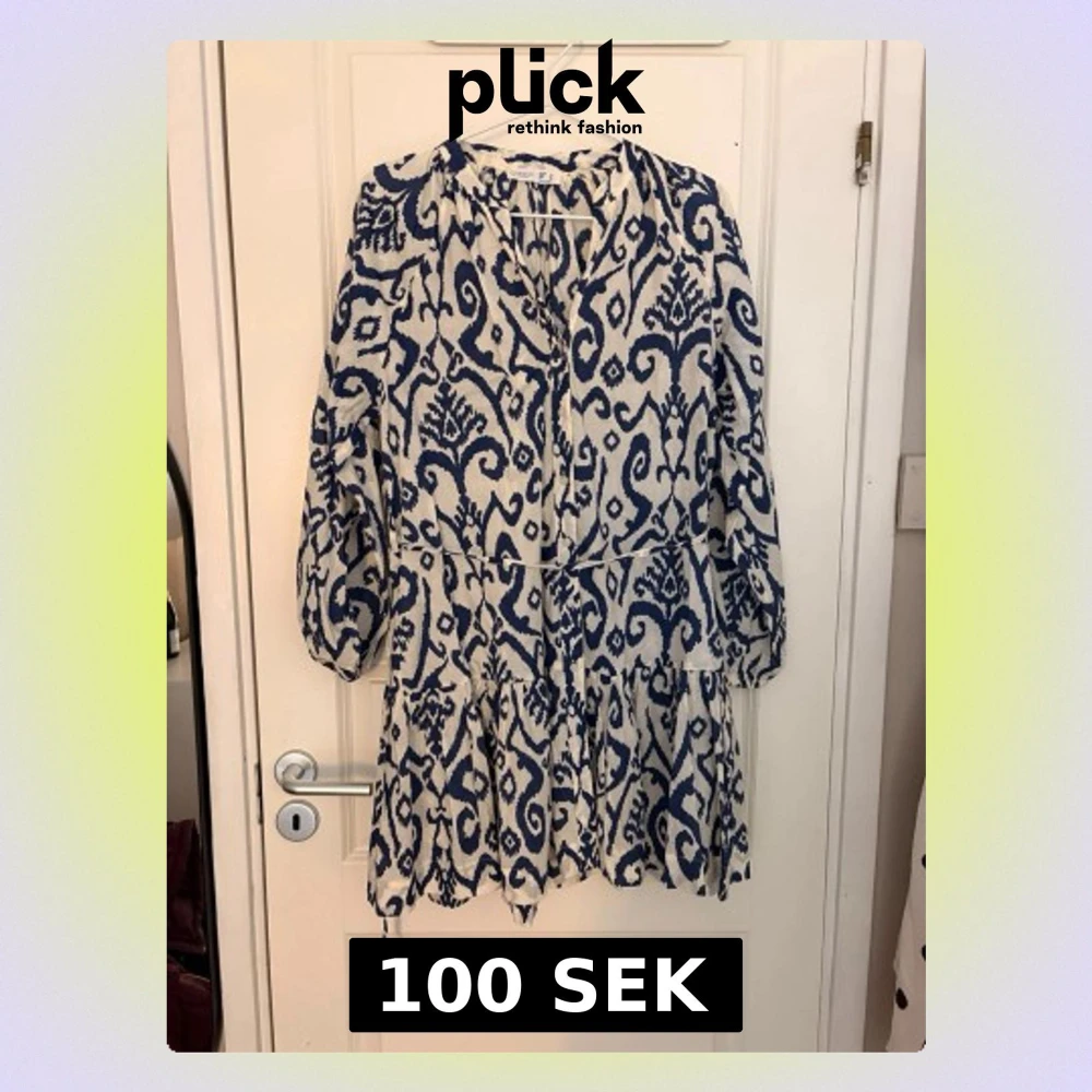 Kortklänning i vitt och blått med ett iögonfallande mönster. Klänningen har långa ärmar med resår vid ärmslut, v-ringning och knytband i midjan för en snygg passform. Tillverkad i ett lätt och luftigt material, perfekt för varmare dagar.