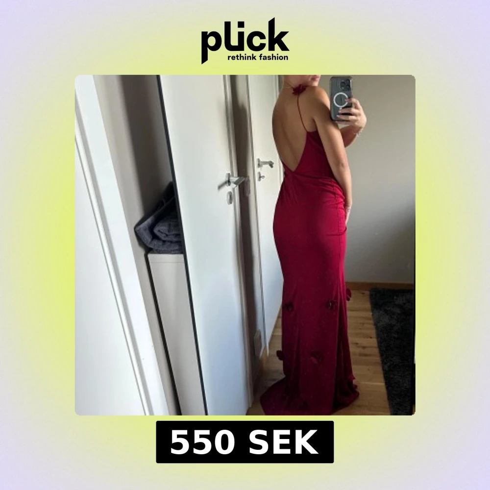 Lång röd balklänning med blommor som detaljer. Klänningen har ett litet släp, jag är 164 som referens. Aldrig använd, köpt begagnad. Tryck inte på KÖP DIREKT utan skriv privat om du är intresserad! 💛