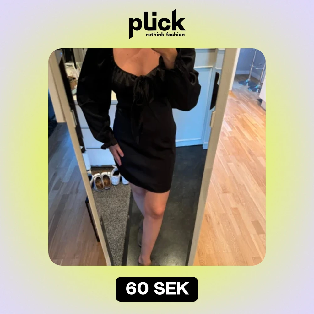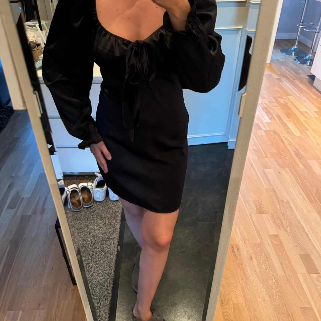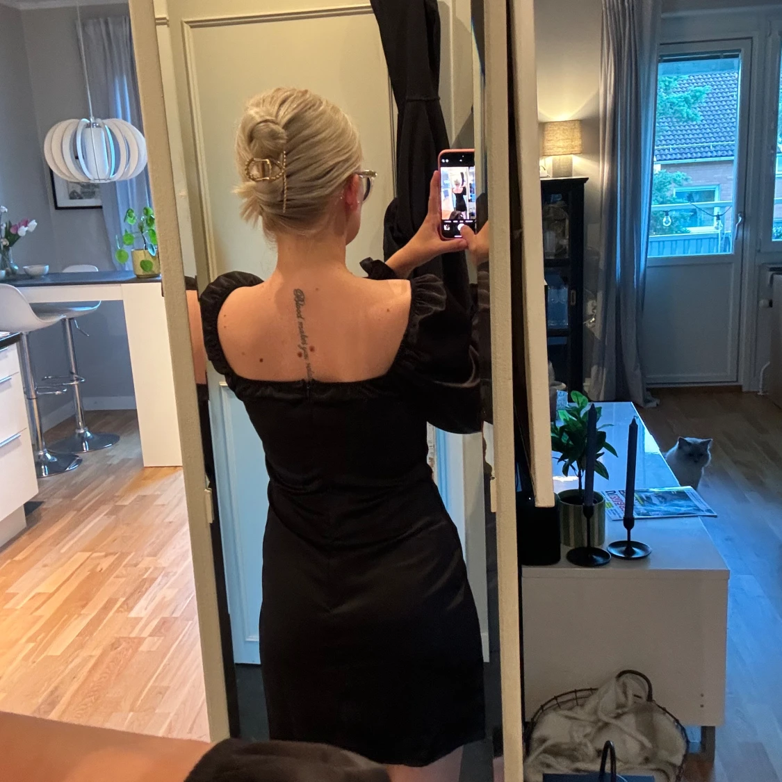 Svart ”satinklänning” med puffärmar, från shein i stl S. Provad men aldrig använd!! Nyskick!!