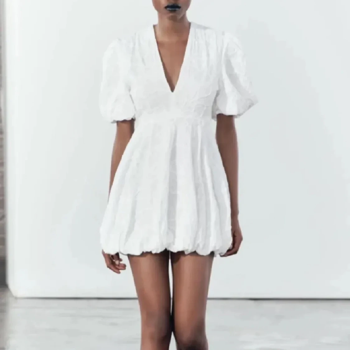 Vit Zara kortklänning med puffärm och v-ringning, storlek S