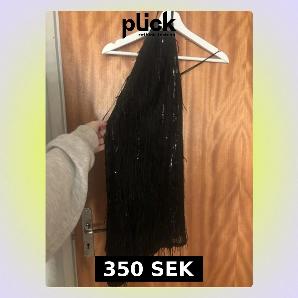 Säljer en svart kortklänning med oneshoulder och tunna axelband. Klänningen är täckt av glittriga paljetter och fransar som ger en riktigt festlig look. Perfekt för dig som vill sticka ut på nästa party! Klänningen har öppen rygg. Den är i ett jätte bra skick då den ej kommit så mycket till användning