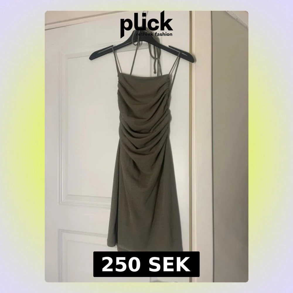 Säljer en grön kort klänning med smala axelband och snygg drapering framtill. Klänningen har öppen rygg med snörning vilket gör passformen framtill justerbar. Den har dubbelt tyg vilket gör att man kan använda utan bh. Den sitter tajt men har ett stretchigt material som gör den bekväm ändå. Jag har klippt bort lappen i ryggen som kunde sticka fram. Perfekt till ett par klackar i sommar! Säljer eftersom jag växt ur den. Skriv vid frågor!🌸