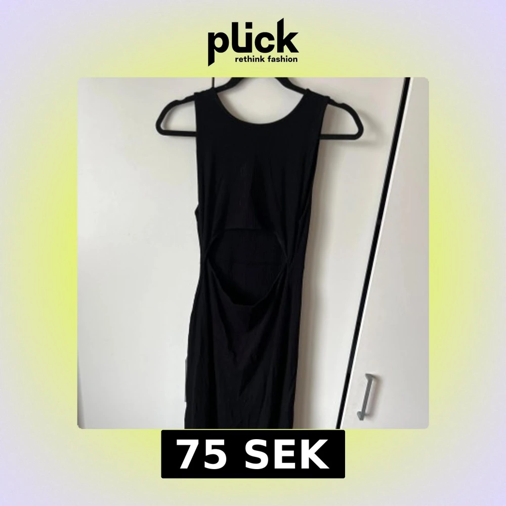 Säljer en svart ribbad klänning med ärmlös design och rund halsringning. Klänningen har en snygg cut-out detalj vid midjan. Går även att vända på den och ha cut-out i ryggen.
