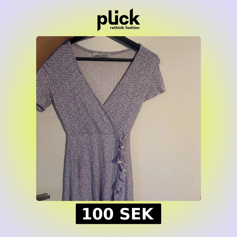 Supersöt ljuslila omlottklänning från Pull&Bear med små vita blommor. Klänningen har korta ärmar, v-ringning och knyt i sidan. Perfekt för vår och sommar! (Tyvärr aldrig använd då den är lite kort i min smak, men sååå fin och somrig)