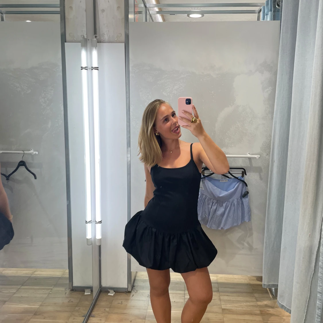 Supersöt svart kort klänning med smala axelband och voluminös volangkjol. Storlek m. Pull and bear
