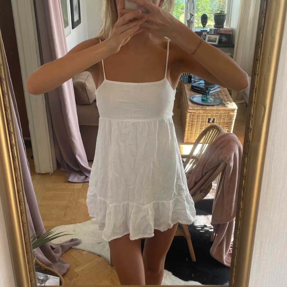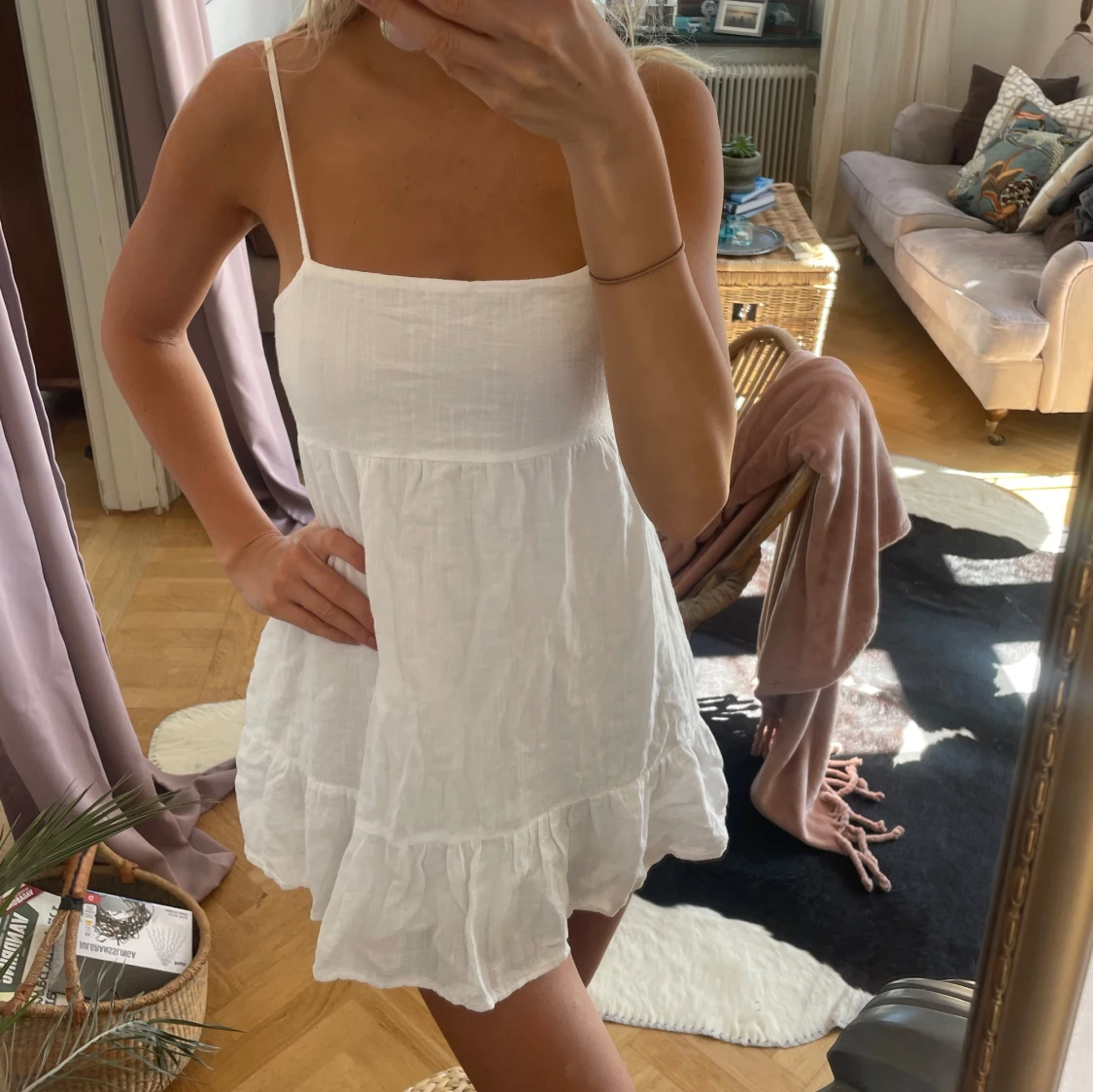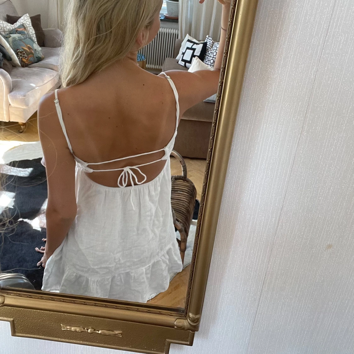 Säljer en så fin vit sommarklänning med djup rygg från pull & bear i storlek S. Man knyter den själv i ryggen så passar de flesta! 🤍🤍