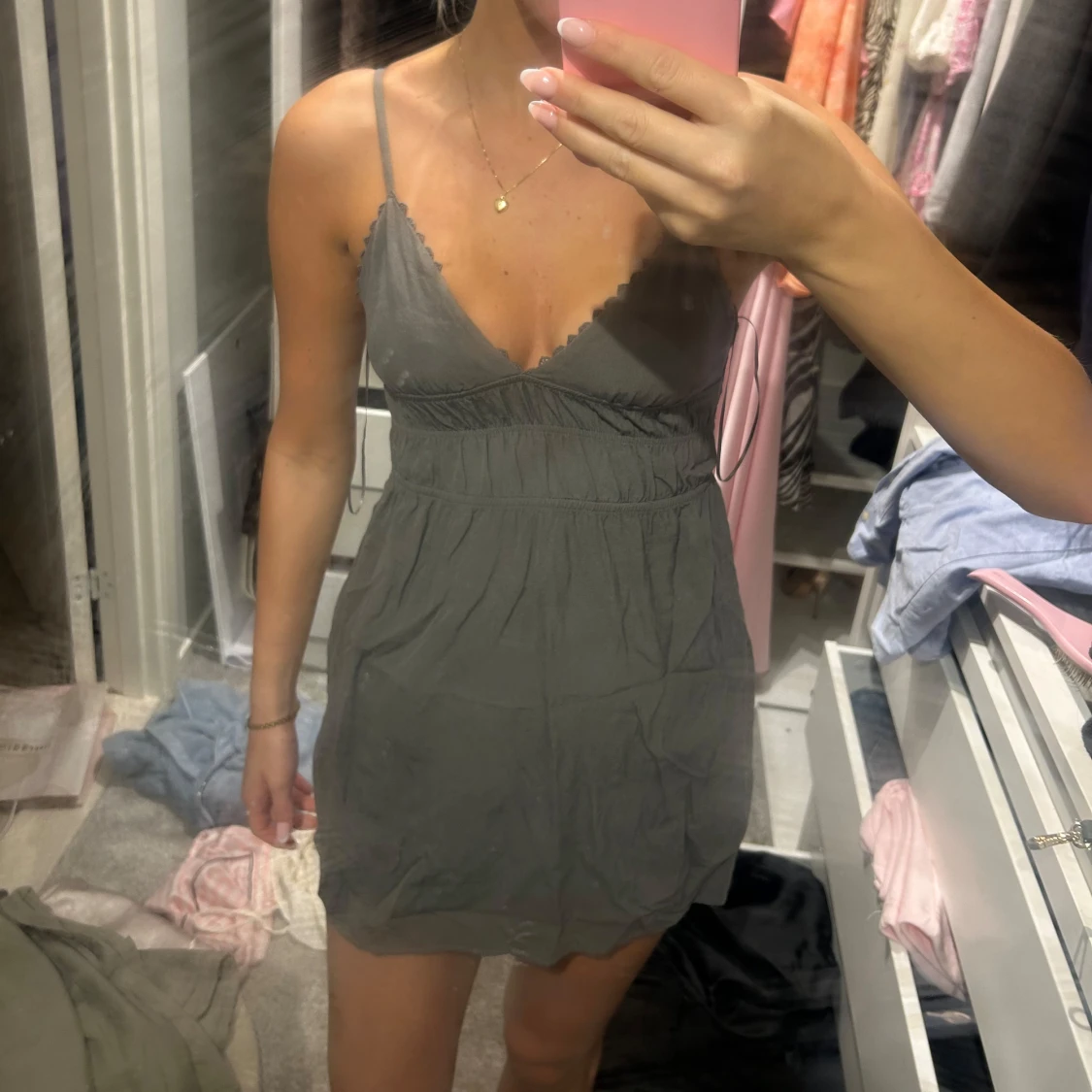 Supersöt grå kort klänning med smala axelband och v-ringning. Klänningen har en markerad midja och lätt rynkad kjol, perfekt för varma dagar. Enkel och stilren design som är lätt att matcha med accessoarer.