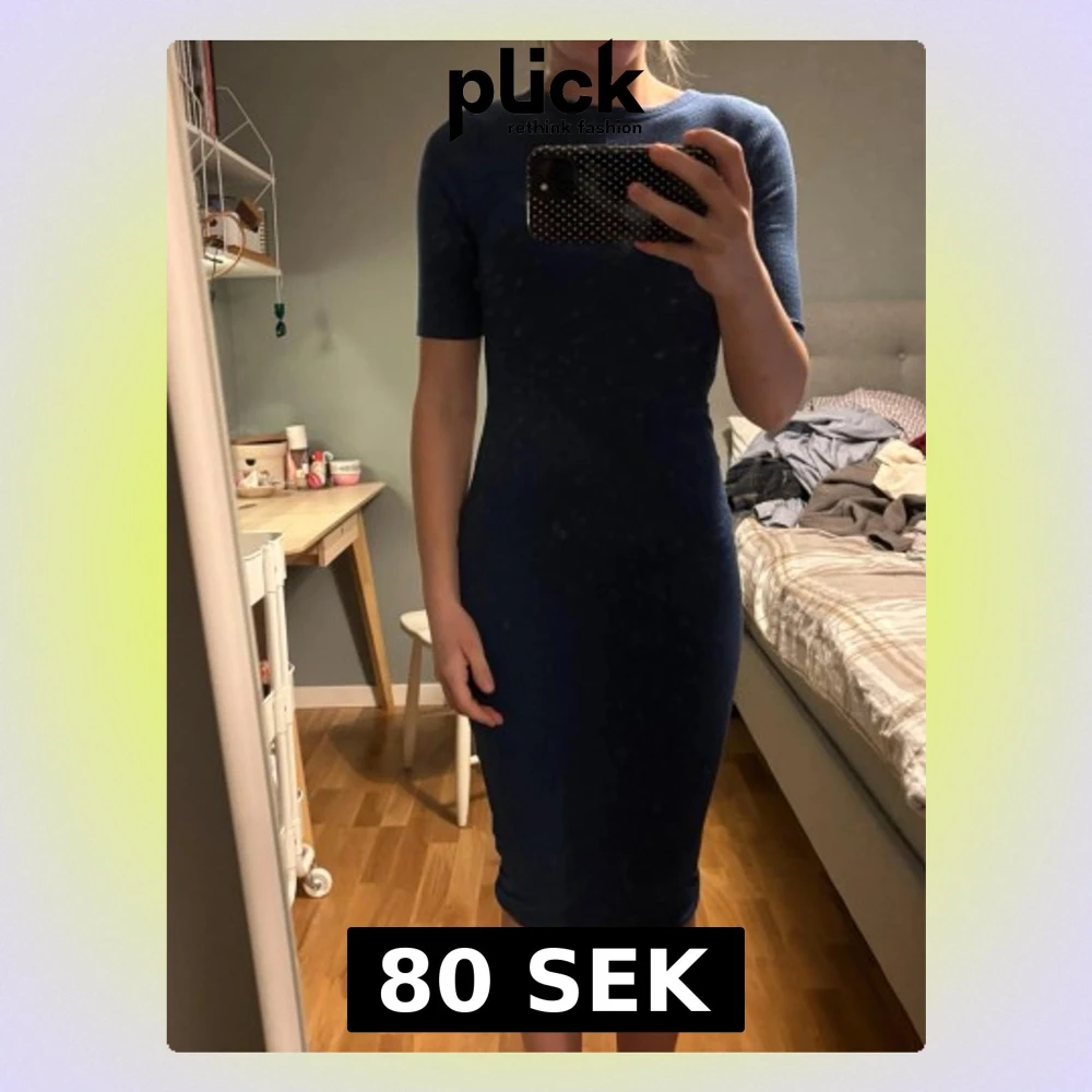 Säljer en marinblå, tight klänning med korta ärmar och rund hals. Klänningen är midilång och har en enkel, stilren design som sitter snyggt mot kroppen. Perfekt för dig som gillar minimalistisk stil.