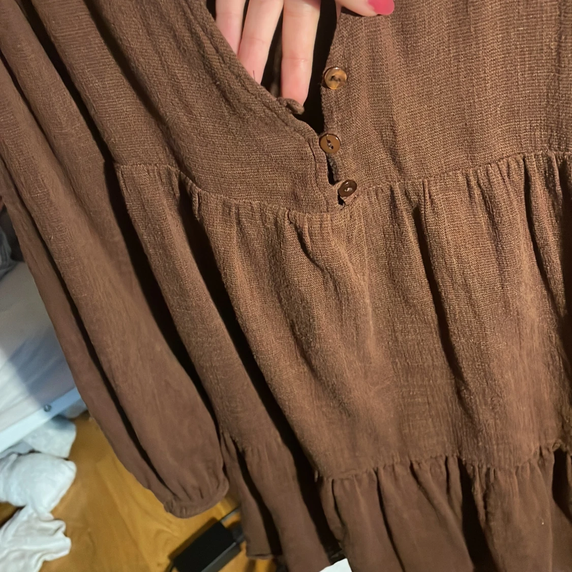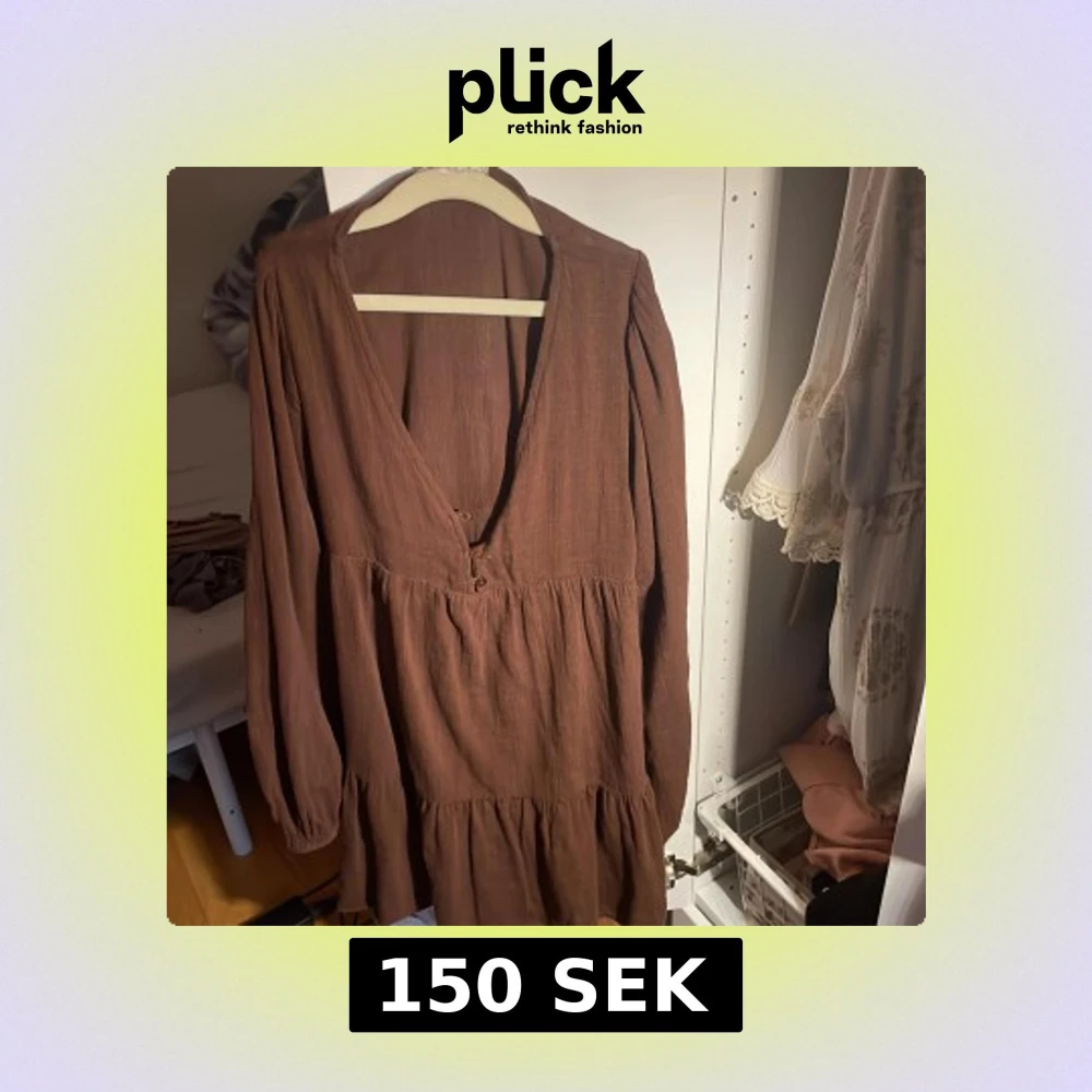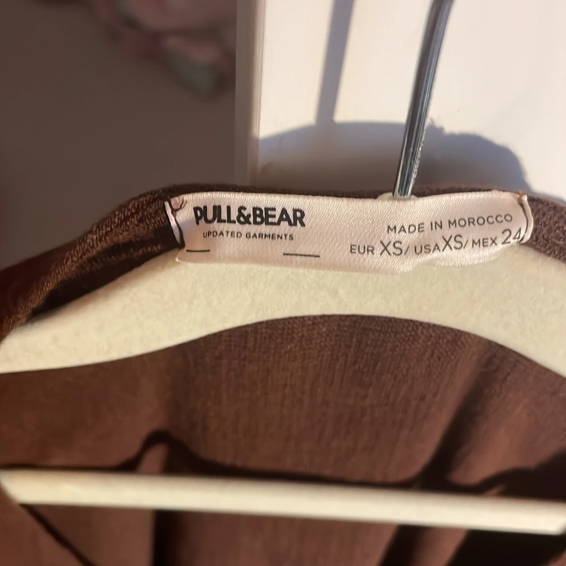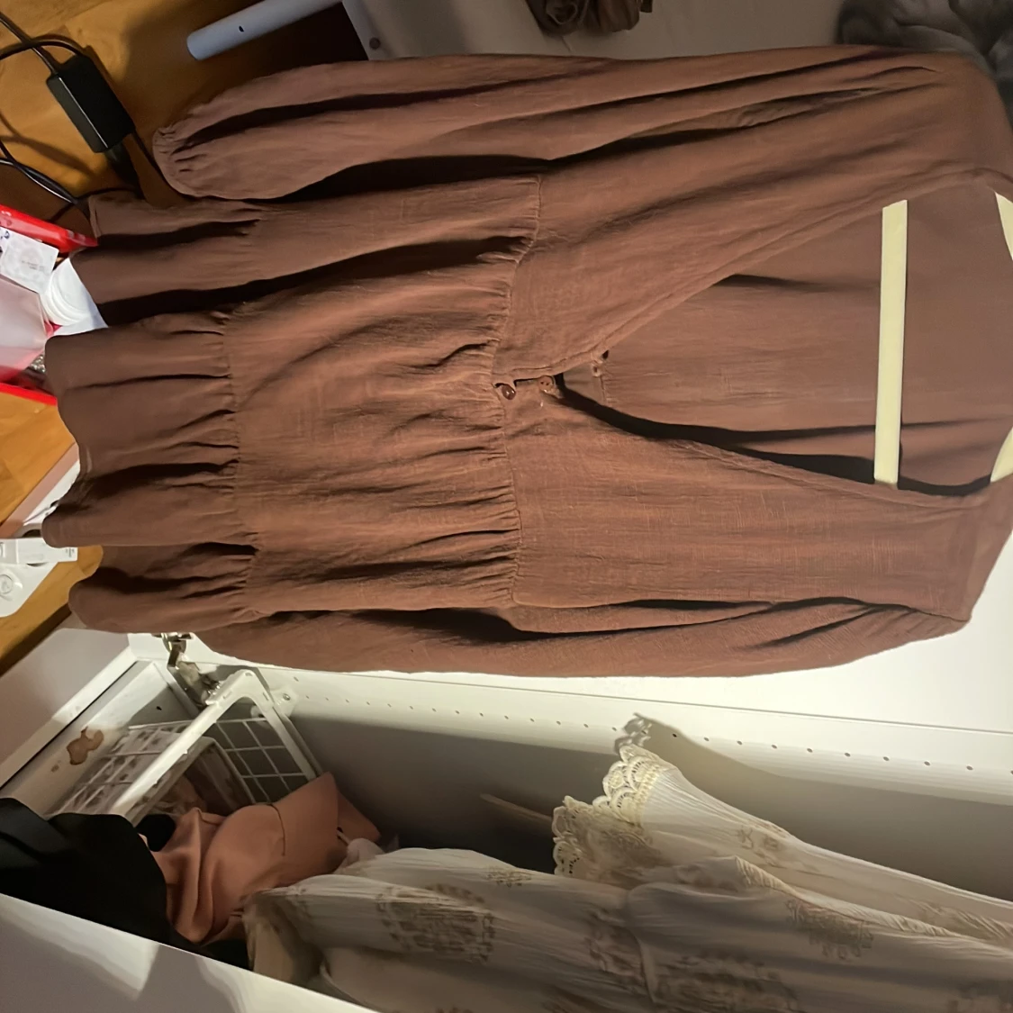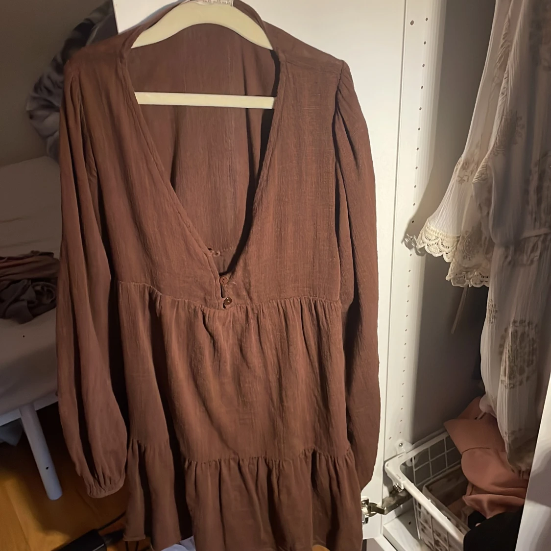 Superfin brun kortklänning från Pull&Bear i storlek XS. Klänningen har v-ringning med knappar framtill, långa ärmar med resår vid handlederna och ett luftigt, rynkat fall. Perfekt för dig som gillar en avslappnad men ändå trendig look.