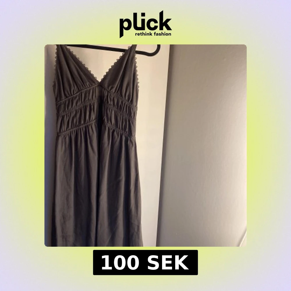 Säljer en grå klänning från Pull&Bear med smockad rygg och v-ringad fram. Klänningen har tunna axelband och dekorativ spetskant längs urringningen. Perfekt för varma dagar och enkel att styla med sneakers eller sandaler. Använd ett fåtal gånger!