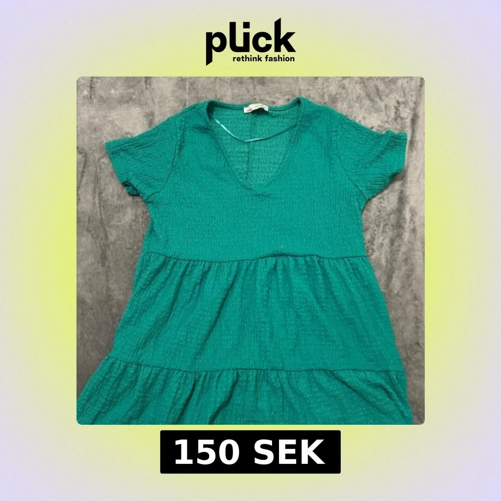 Supersöt grön kortklänning från Pull&Bear med v-ringning och korta ärmar. Klänningen har en crinklad struktur och volanger i kjolen som ger en avslappnad och trendig look. Perfekt för varma dagar när du vill vara både bekväm och snygg.
