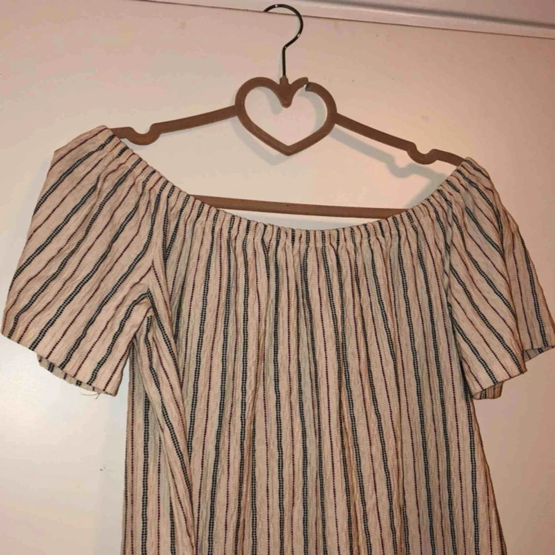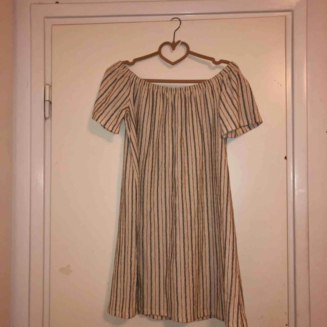 Söt randig off-shoulder klänning från Pull&Bear. Endast använd en gång, i mycket gott skick. Kan mötas upp i Stockholm eller ev skicka mot fraktkostnad!