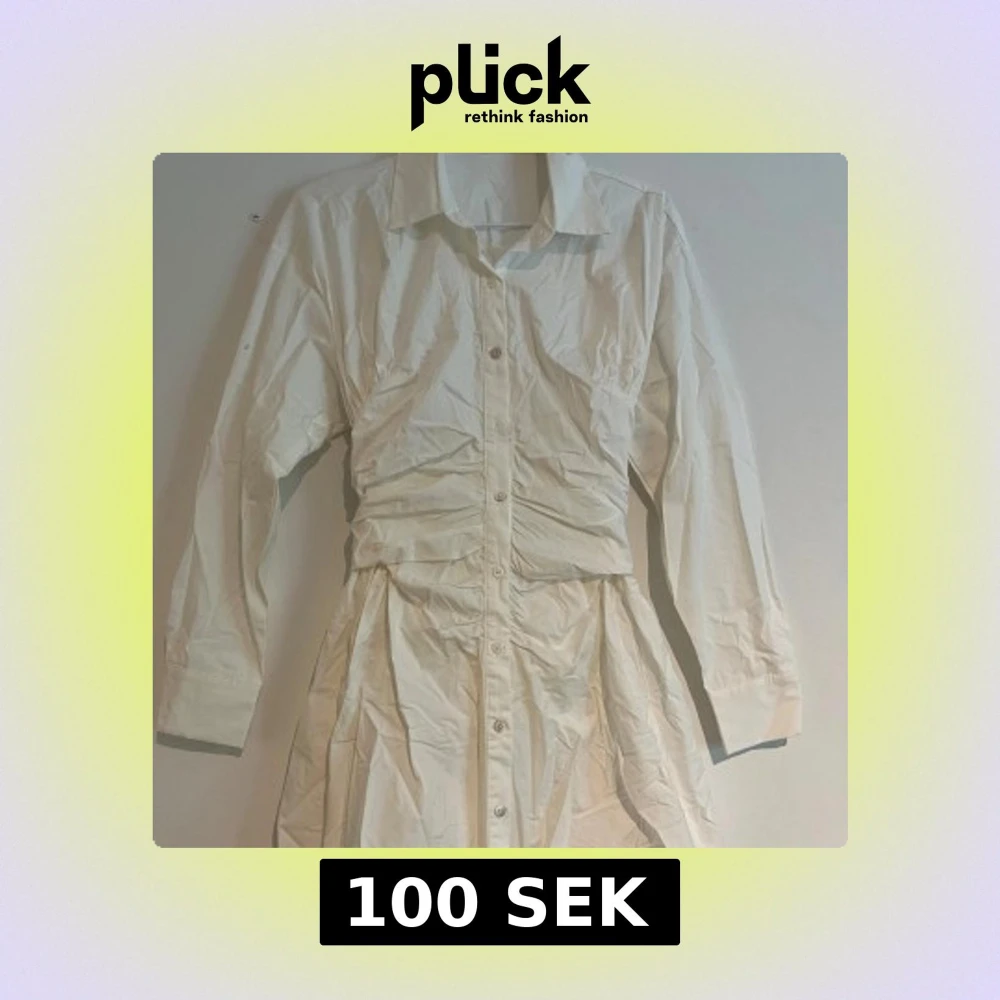 Stilren vit skjortklänning med lång ärm, klassisk krage och knappar hela vägen framtill. Klänningen har markerad midja med rynkade detaljer och lätt utställd kjol. Helt oanvänd.
