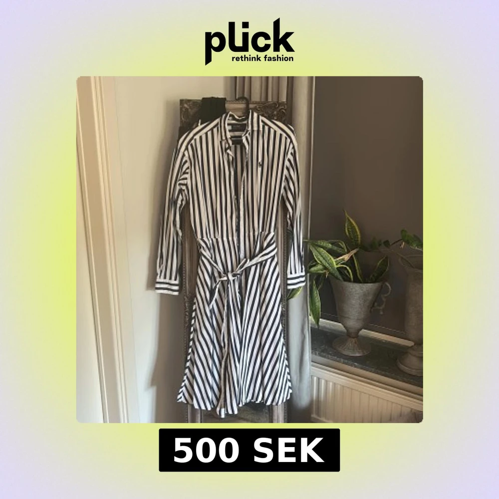 Snygg skjortklänning från Polo Ralph Lauren i vitt och marinblått med vertikala ränder. Klänningen har lång ärm, knappar framtill, klassisk krage och avtagbart bälte i midjan. Tillverkad i bomull och har broderad logga på bröstet. Perfekt för en fräsch och stilren look.