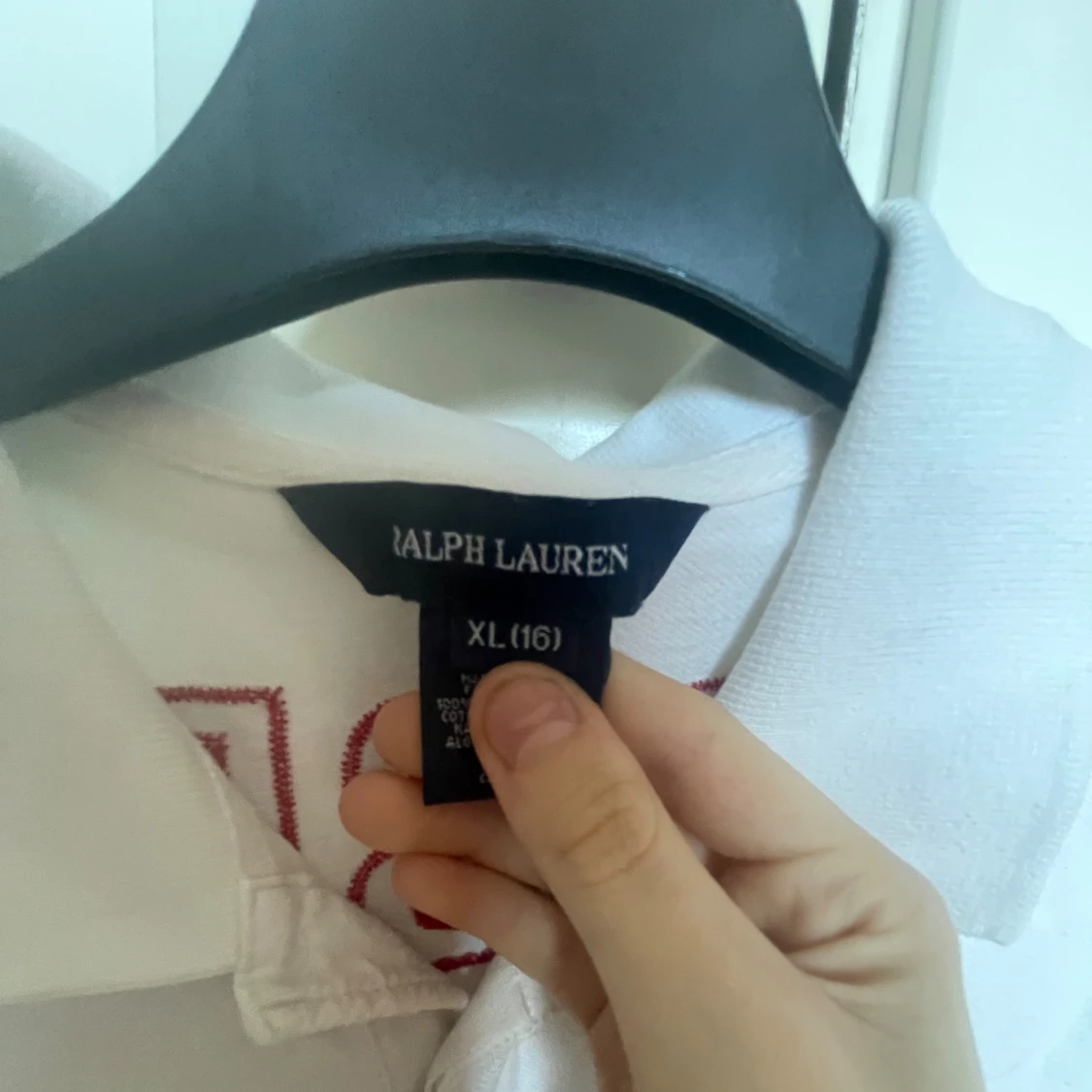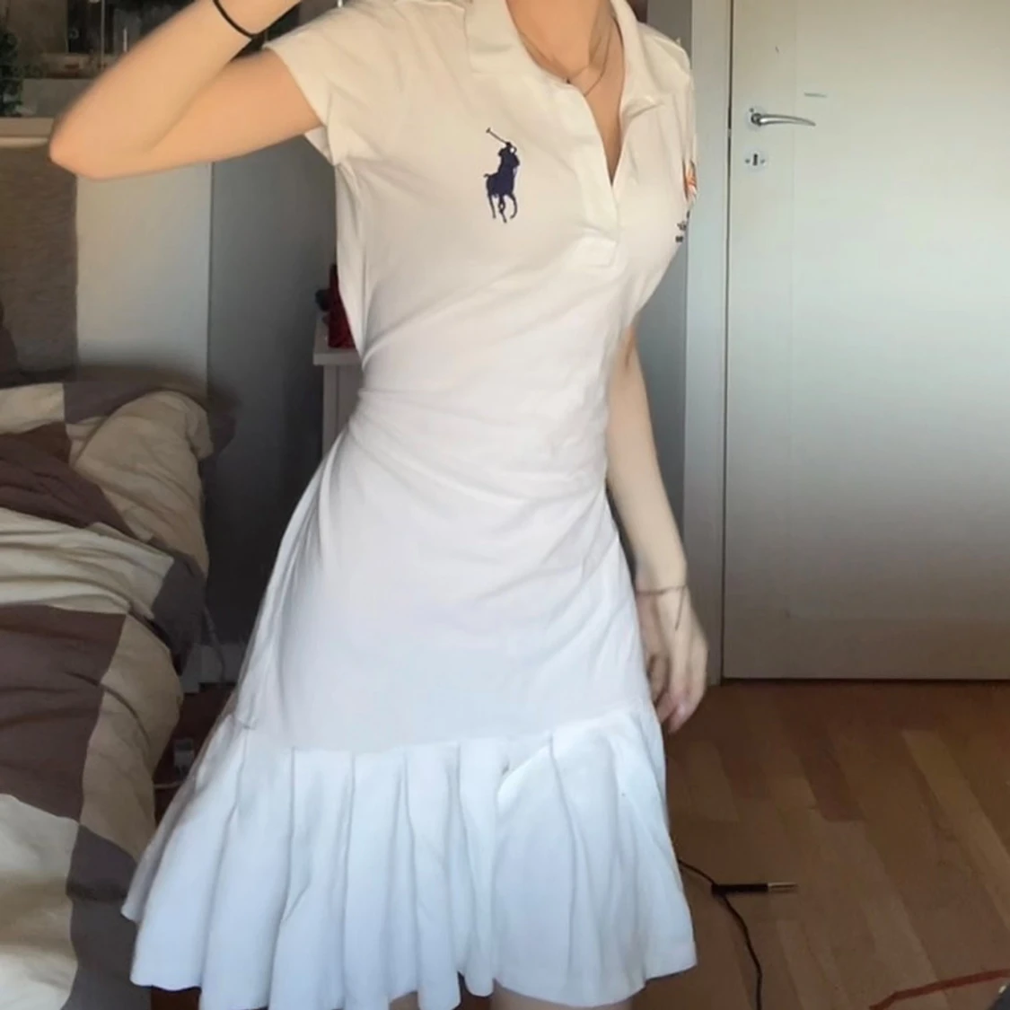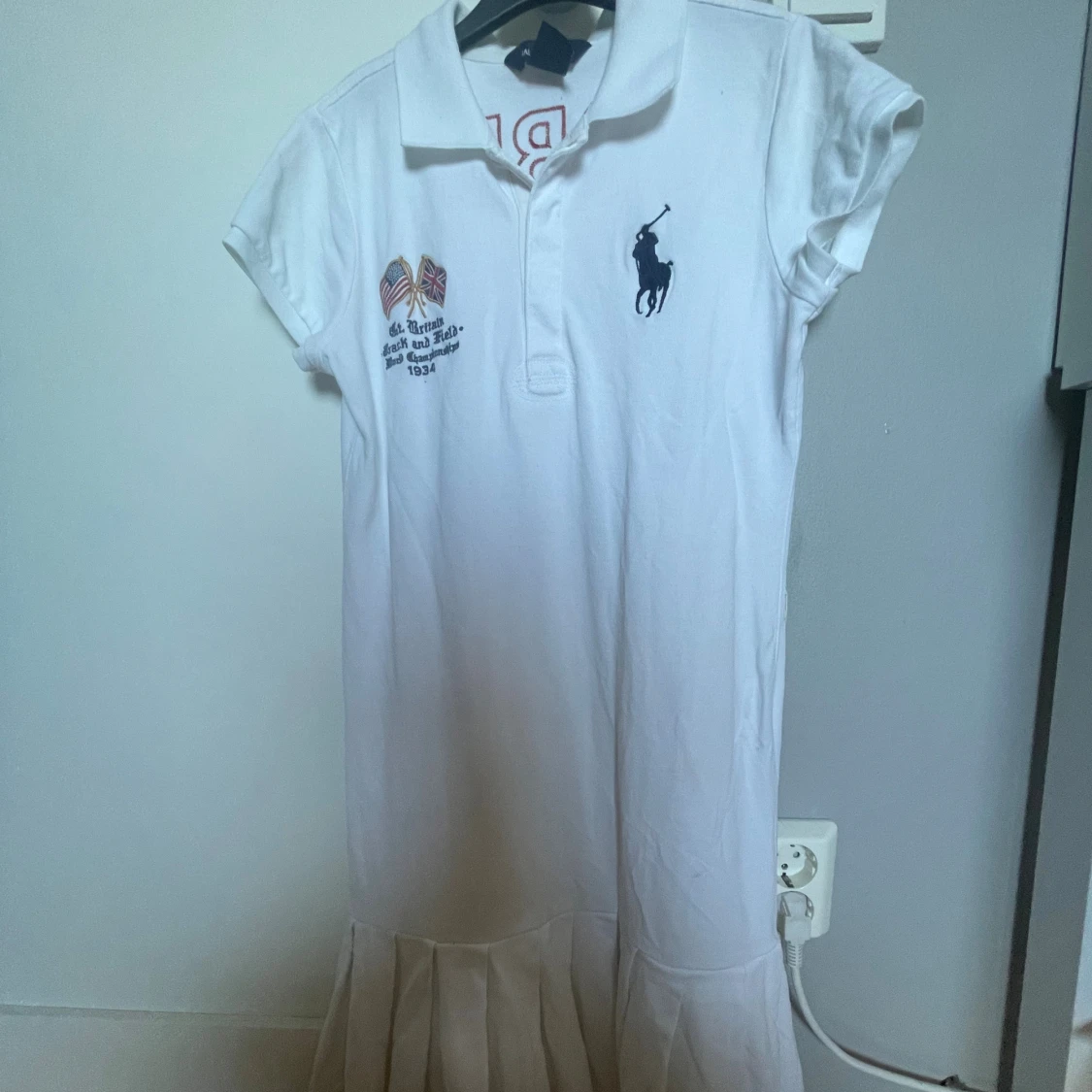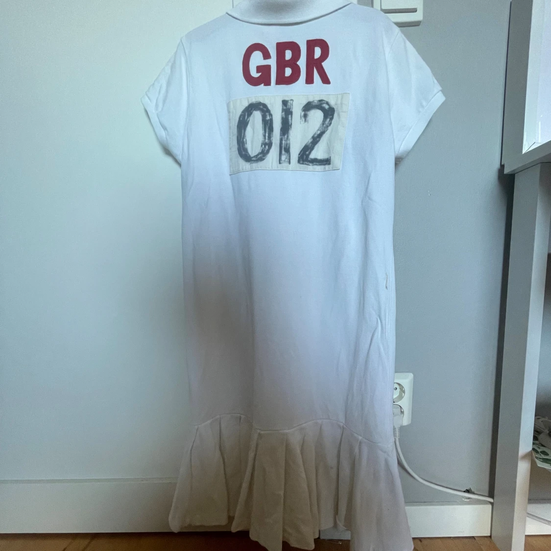 Vit kort pikéklänning från Ralph Lauren med klassisk krage, korta ärmar och volangkant nertill. Stor broderad logga framtill, tryck och broderier med brittiskt tema samt nummer på ryggen. Tillverkad i mjuk bomull, perfekt för en sportig och stilren look.