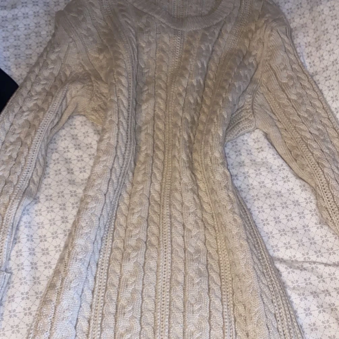 Supermysig beige stickad långklänning med grova kabelstickade detaljer och rund hals. Perfekt för dig som gillar en chill och varm look under kyliga dagar. Klänningen har långa ärmar och en figurnära passform som framhäver siluetten.